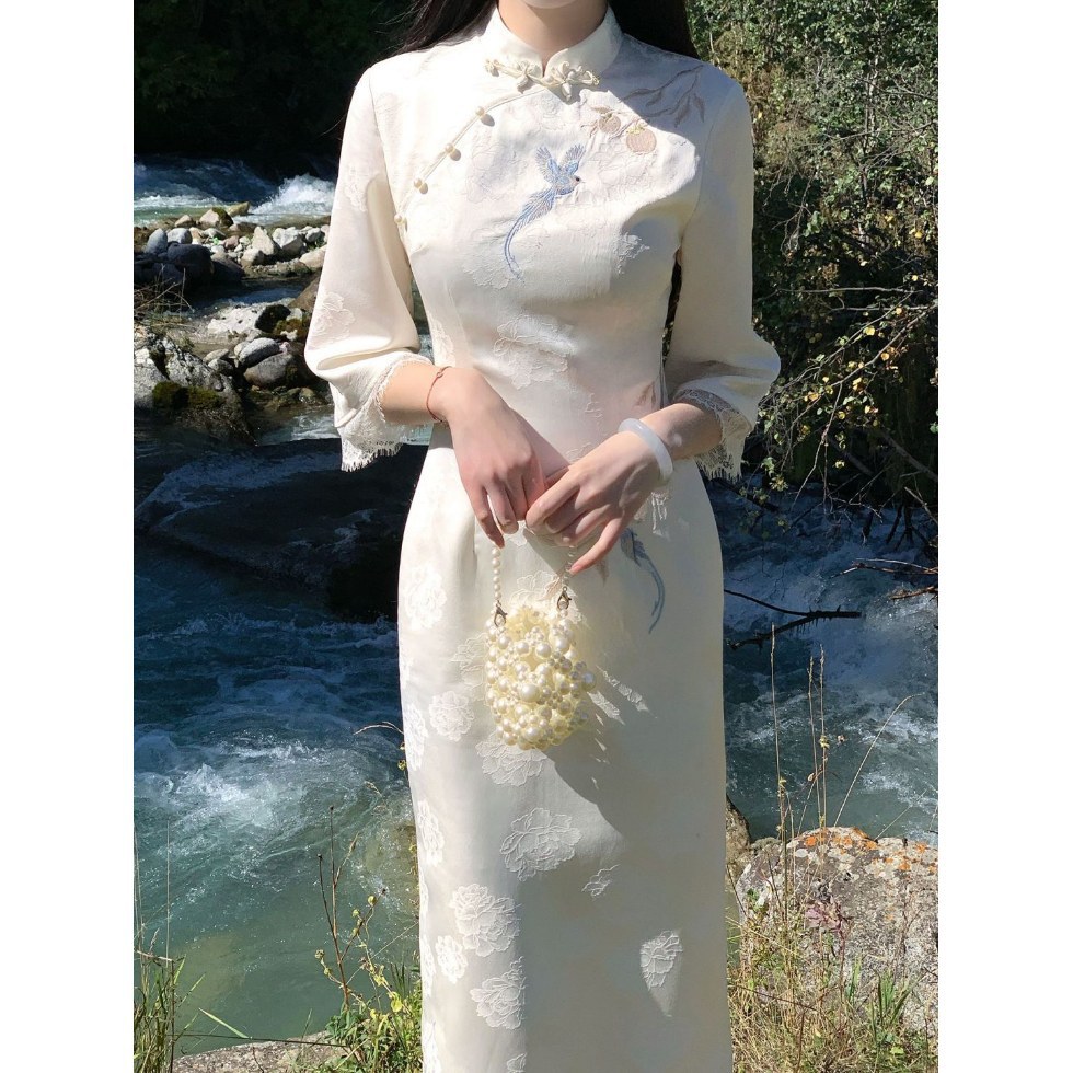 白の逆大袖長袖チャイナドレス秋冬日常改良民国大お嬢さんの絶美気質高級感