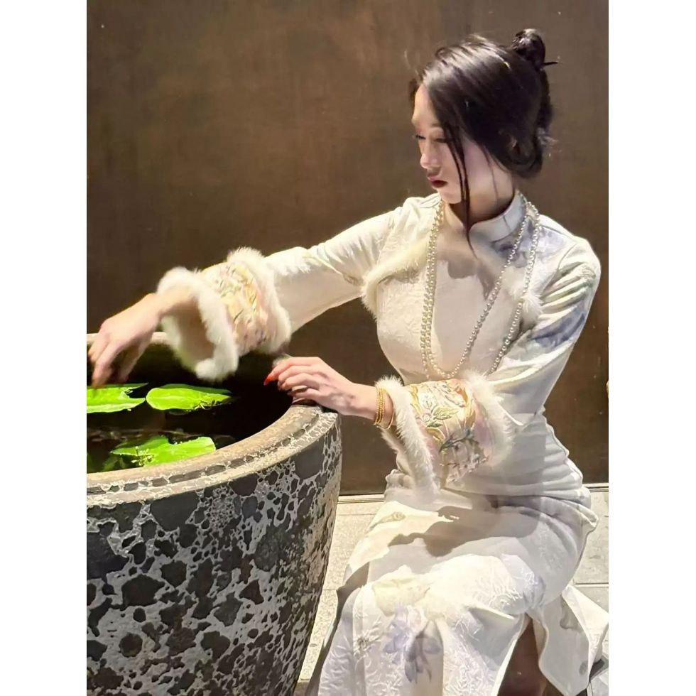 新中式改良旗袍2025新款女冬季毛领长袖国风高端年轻款日常连衣裙