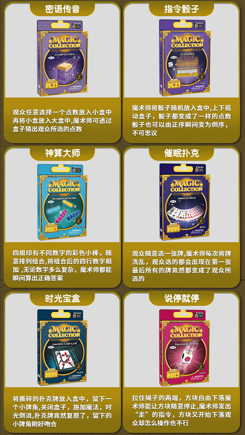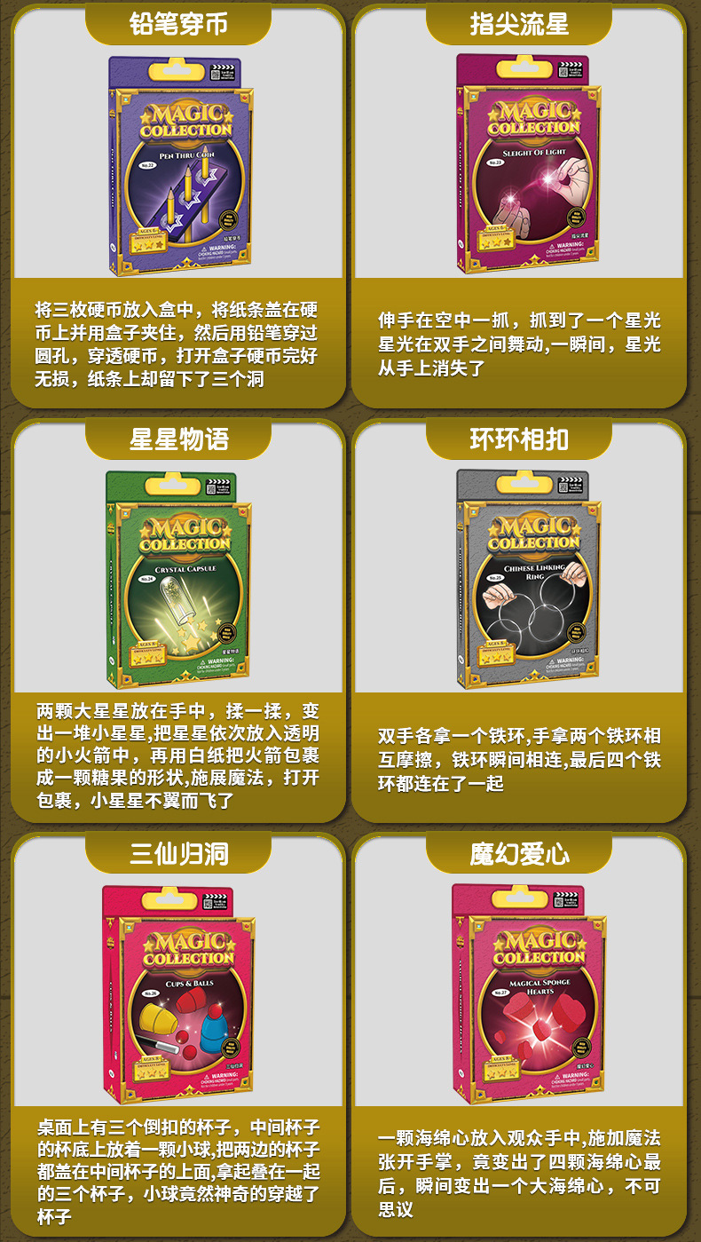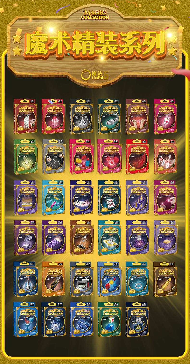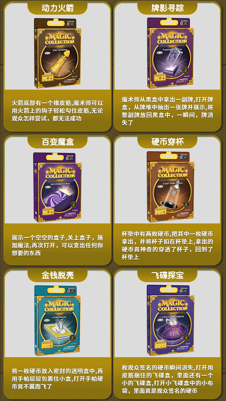 Ball & Vase日月神杯,Dice Explosion爆炸骰子,Dice Explosion断物还原,Clairaudience听音辨色,Rings & cion食币精灵,Floating Vase空中悬瓶,Coin Cascade硬币隧道,Magic Money Printer迷你银行,In & Outer Ball Box空间魔盒,Ring On Chain魔法项链,The Snapper动力火箭,Vanishing Deck 牌影寻踪,Mysterious Box百变魔盒,Coin Thru Glass硬币穿杯,Coin Frame Escape金钱脱壳,Coin in Nest of UFO飞碟探宝,Clairvoyance密语传音,Flash Dice指令骰子,Number Cruncher神算大师,Mirage Deck催眠扑克,Amazing Card Case时光宝箱,Pen Thru Coin铅笔穿币,Time Capsule星星物语,Cups & Balls三仙归洞,Magical Sponge Hearts魔幻爱心,Vanishing Hanky丝巾隐身,Stripper Deck千变扑克,Coin Paddle Illusion隔空取钱,Vanishing Coin硬币消失,Professor's Nightmare三绳奇术,Obedient cube说停就停,Pen Thru Bill神笔穿钞,Burglar Ball穿墙入室,【卡装】口袋魔术-千变扑克..米奇,【卡装】口袋魔术-千变扑克..冰雪奇缘,【卡装】口袋魔术-听令筛子..米奇,【卡装】口袋魔术-听令筛子..冰雪奇缘,【卡装】口袋魔术-复原魔棒..米奇,【卡装】口袋魔术-复原魔棒..冰雪奇缘,【卡装】口袋魔术-铅笔穿币..米奇,【卡装】口袋魔术-铅笔穿币..冰雪奇缘