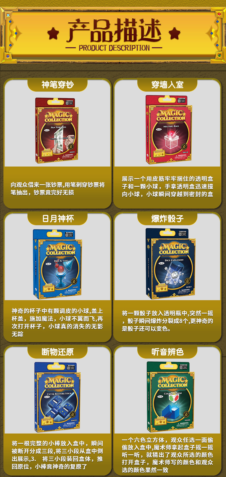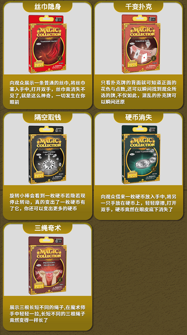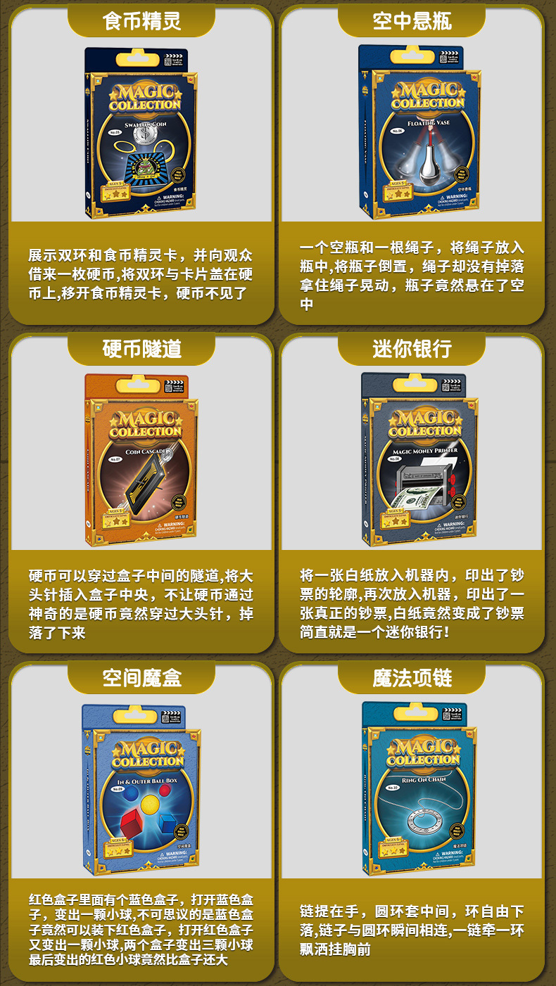 Ball & Vase日月神杯,Dice Explosion爆炸骰子,Dice Explosion断物还原,Clairaudience听音辨色,Rings & cion食币精灵,Floating Vase空中悬瓶,Coin Cascade硬币隧道,Magic Money Printer迷你银行,In & Outer Ball Box空间魔盒,Ring On Chain魔法项链,The Snapper动力火箭,Vanishing Deck 牌影寻踪,Mysterious Box百变魔盒,Coin Thru Glass硬币穿杯,Coin Frame Escape金钱脱壳,Coin in Nest of UFO飞碟探宝,Clairvoyance密语传音,Flash Dice指令骰子,Number Cruncher神算大师,Mirage Deck催眠扑克,Amazing Card Case时光宝箱,Pen Thru Coin铅笔穿币,Time Capsule星星物语,Cups & Balls三仙归洞,Magical Sponge Hearts魔幻爱心,Vanishing Hanky丝巾隐身,Stripper Deck千变扑克,Coin Paddle Illusion隔空取钱,Vanishing Coin硬币消失,Professor's Nightmare三绳奇术,Obedient cube说停就停,Pen Thru Bill神笔穿钞,Burglar Ball穿墙入室,【卡装】口袋魔术-千变扑克..米奇,【卡装】口袋魔术-千变扑克..冰雪奇缘,【卡装】口袋魔术-听令筛子..米奇,【卡装】口袋魔术-听令筛子..冰雪奇缘,【卡装】口袋魔术-复原魔棒..米奇,【卡装】口袋魔术-复原魔棒..冰雪奇缘,【卡装】口袋魔术-铅笔穿币..米奇,【卡装】口袋魔术-铅笔穿币..冰雪奇缘
