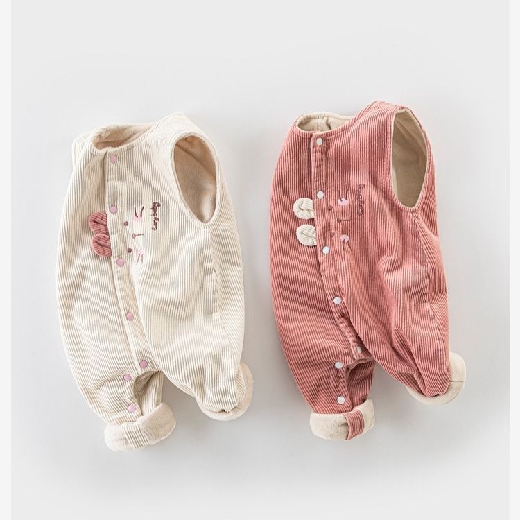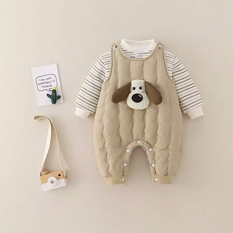 婴儿秋冬薄棉连体衣服新款加绒保暖宝宝冬装超萌可爱背带棉裤套装
