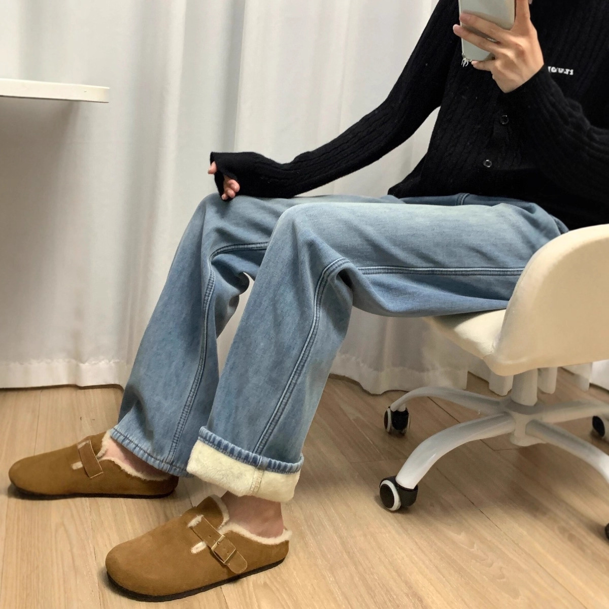 175高个子加长版170冬季加绒加厚牛仔裤女高腰显瘦浅蓝色直筒长裤