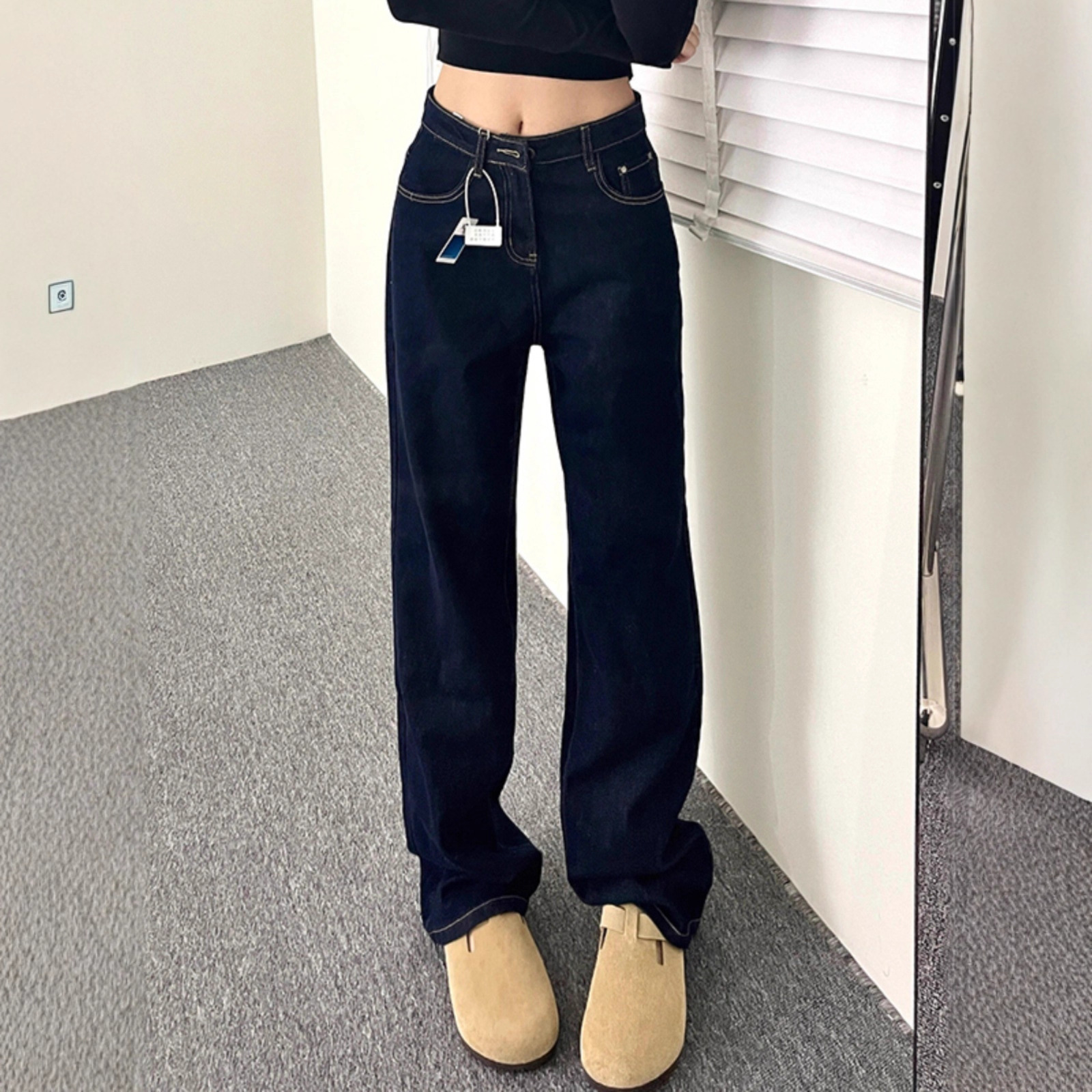 175背の高いジーンズの女性の超ロングタイプの紺色の腰がゆったりしています。
