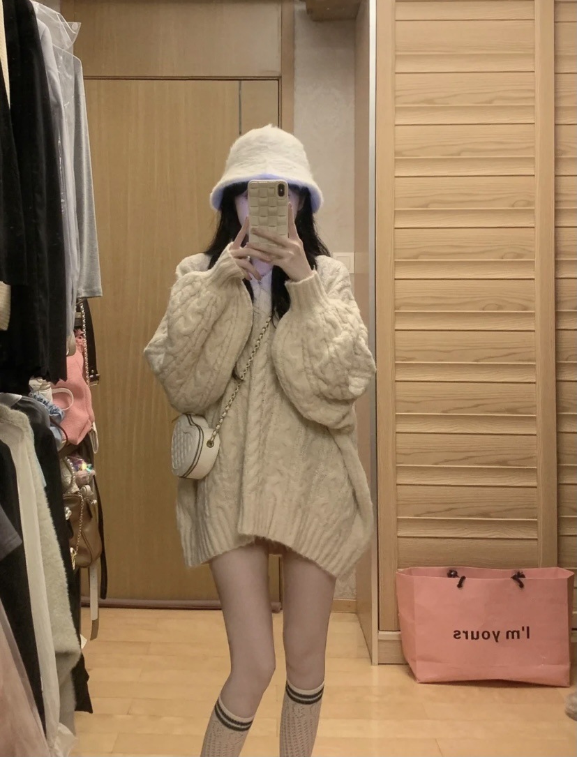 ミンクの毛のセーターの女性はゆったりしていて、怠惰な風の下半身が行方不明になりました。
