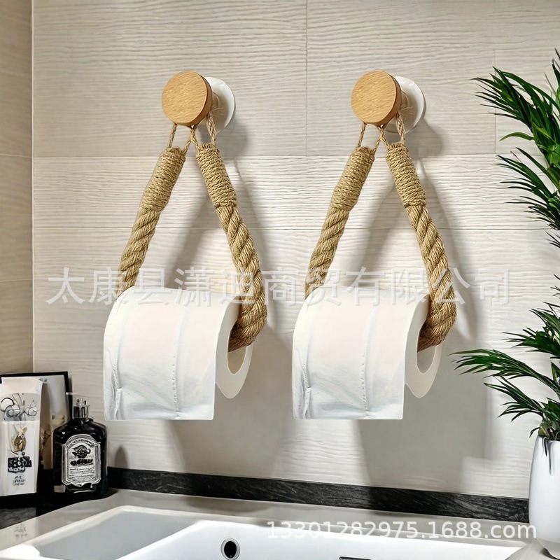 麻ロープペーパータオルラック無垢材綿ロープ織物収納タオルラックフェイスタオル収納ラッククリエイティブパンチフリーペーパーロールラック