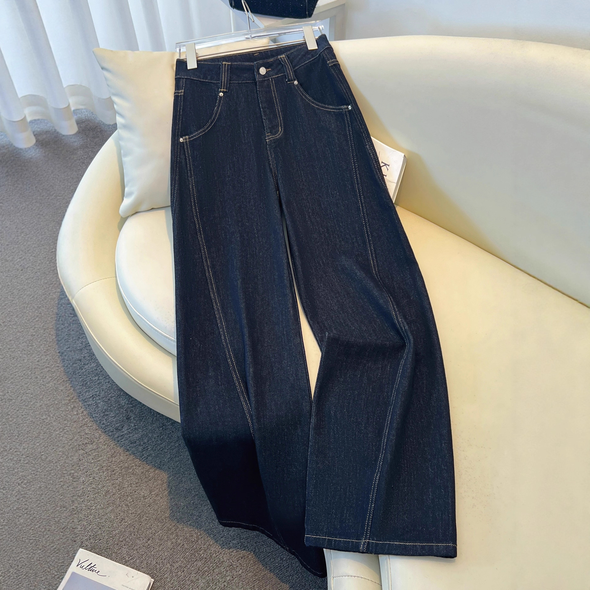 女性用ダークブルーワイドレッグジーンズ2025春秋新作ハイエンドレトロフロアレングスパンツルーズスリミングストレートパンツ