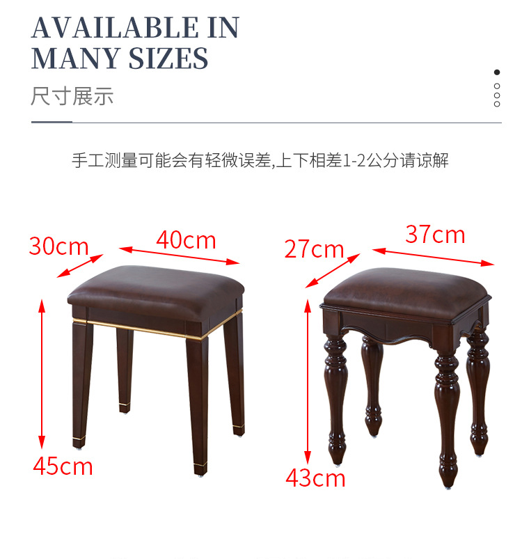 颜色 胡桃色圆柱方凳(棕皮革) 43厘米高度,胡桃色圆柱方凳(深咖色皮革) 43厘米高度,胡桃色圆柱方凳(深蓝色皮革) 43厘米高度,胡桃色圆柱方凳(深绿色皮革) 43厘米高度,胡桃色圆柱方凳(金色皮革) 43厘米高度,胡桃色圆柱方凳(金色绒布) 43厘米高度,胡桃色圆柱方凳(红花绒布) 43厘米高度,胡桃色金边方腿凳子深咖色皮革 45厘米高度,胡桃色金边方腿凳子珍珠白皮革 45厘米高度,胡桃色金边方腿凳子金色皮革 45厘米高度,胡桃色金边方腿凳子蓝色皮革 45厘米高度,胡桃色金边方腿凳子绿色皮革 45厘米高度,黑色金边方腿凳子黑色皮革 45厘米高度,黑色金边方腿凳子珍珠白皮革 45厘米高度,黑色金边方腿凳子金色皮革 45厘米高度,黑色金边方腿凳子蓝色皮革 45厘米高度,黑色金边方腿凳子绿色皮革 45厘米高度,黑色圆柱珍珠白皮革 43厘米高度,黑色圆柱黑色皮革 43厘米高度