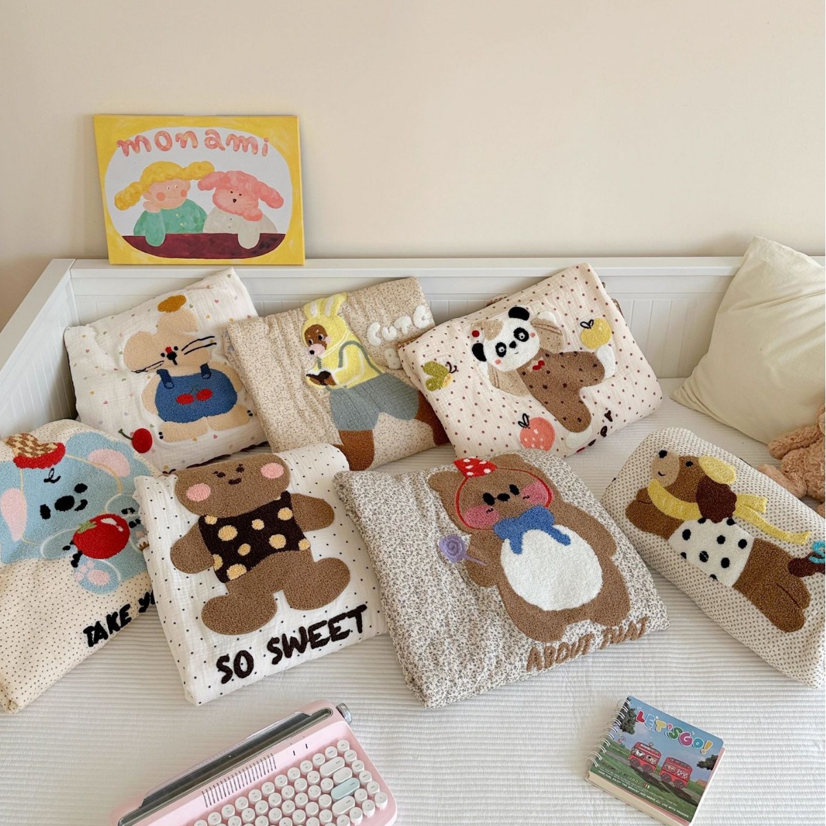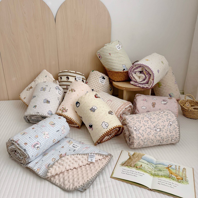 韩系母婴全棉皱皱纱布绒绒毯子卡通刺绣宝宝盖毯沙发毯办公室