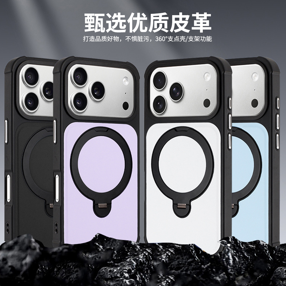 适用iPhone17Pro磁吸手机壳PU皮革支架款后壳苹果16Pro保护套批发