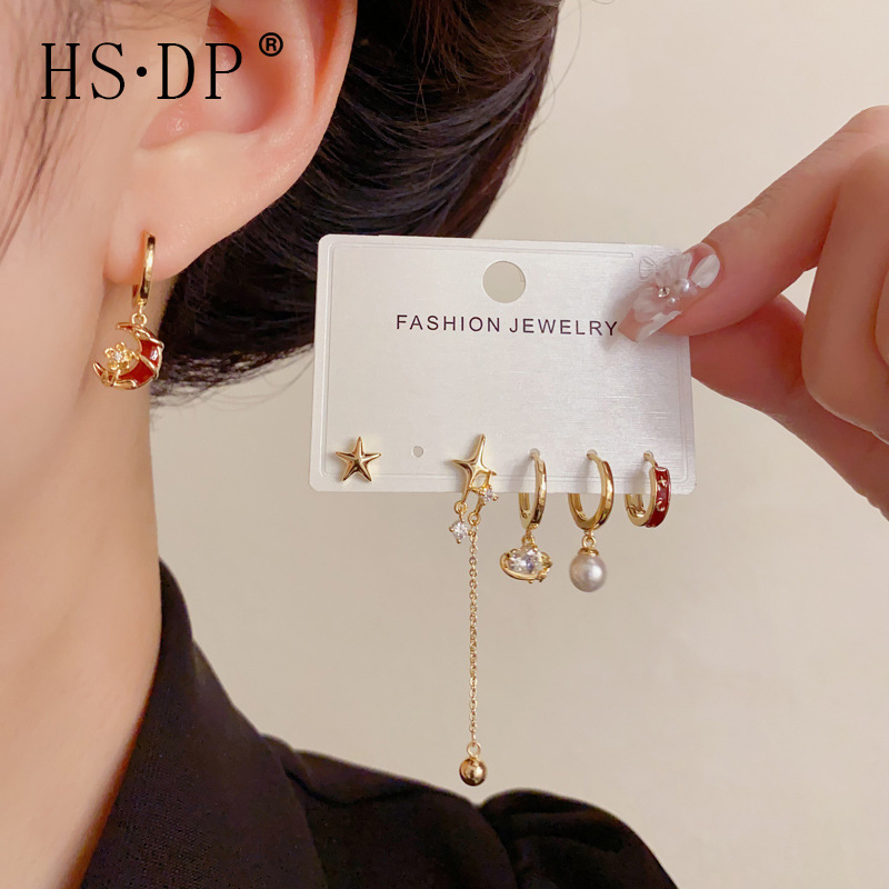 秋冬新款个性夸张红色星月链条三件套耳坠气质时尚复古百搭耳扣女