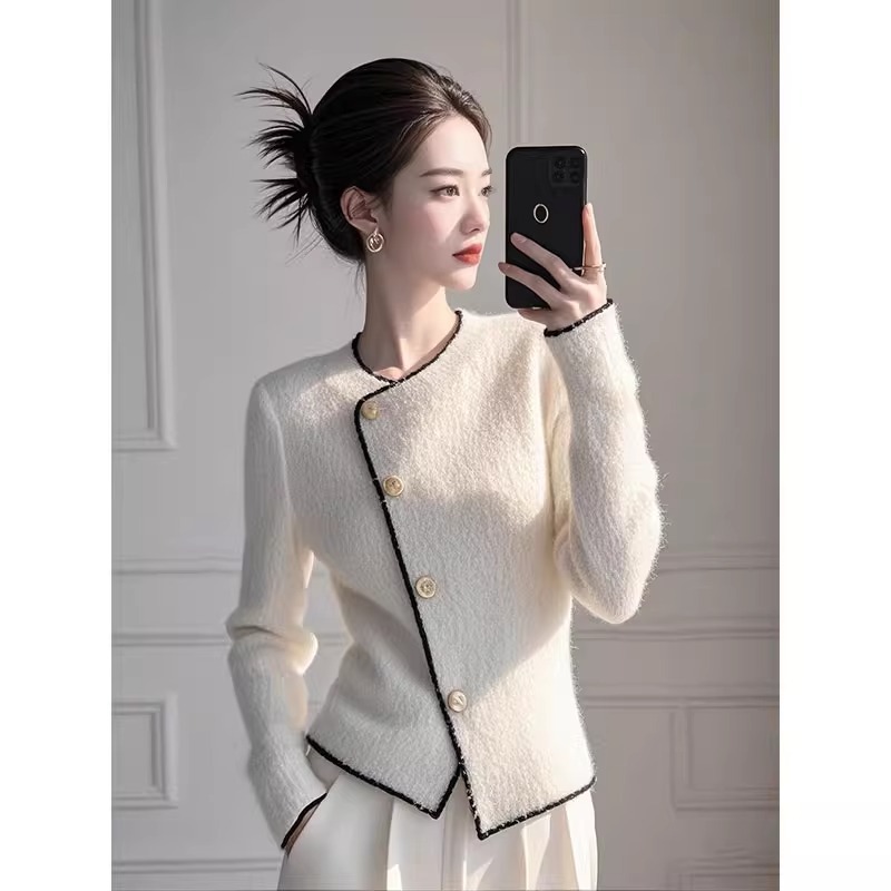 韓系の小香風の斜め列のボタンのニットのカーディガンの女性の春秋の新型の高級感の柔らかいモチモチの気質はやせているコートの潮を現します。