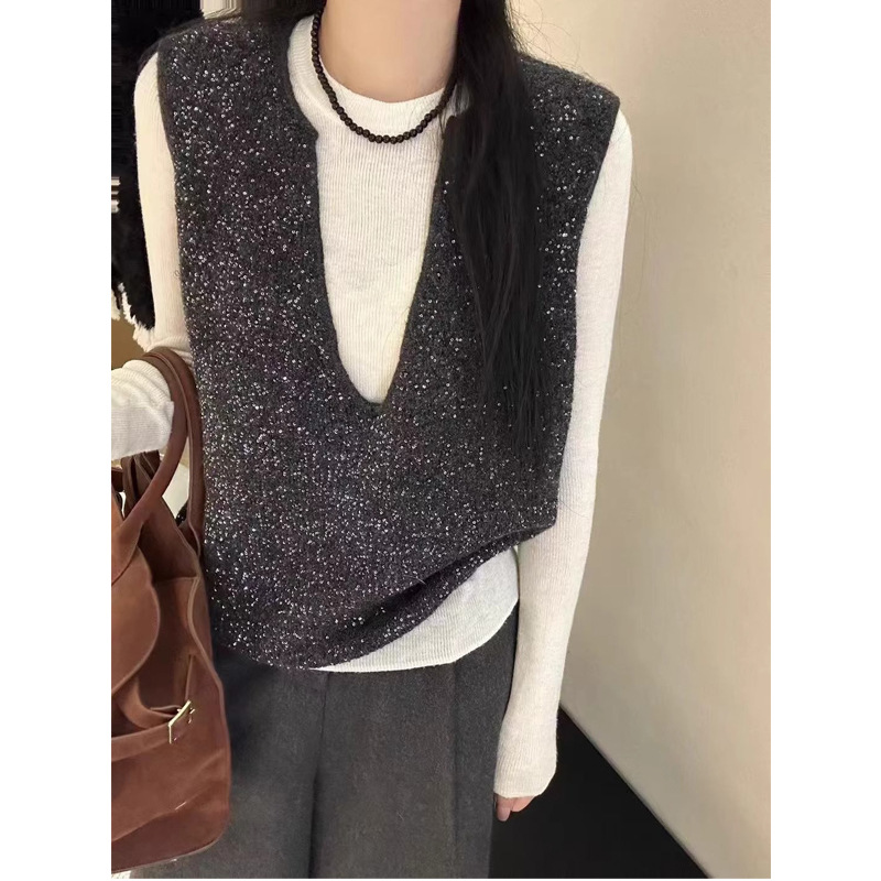超美しいフランスの気質のスパンコールニットのベストのゆったりしたベストの上着2025春と秋に上着を着ます。