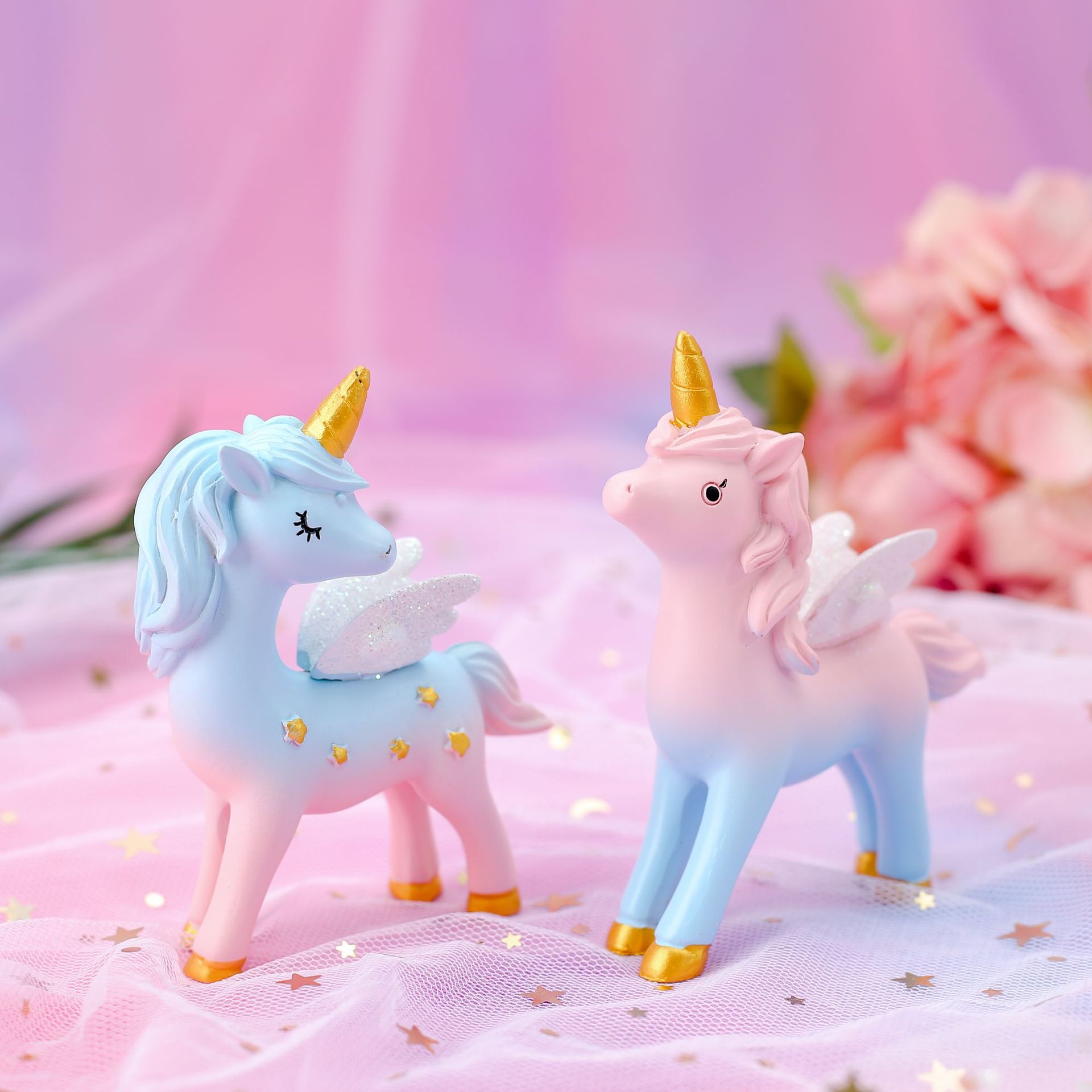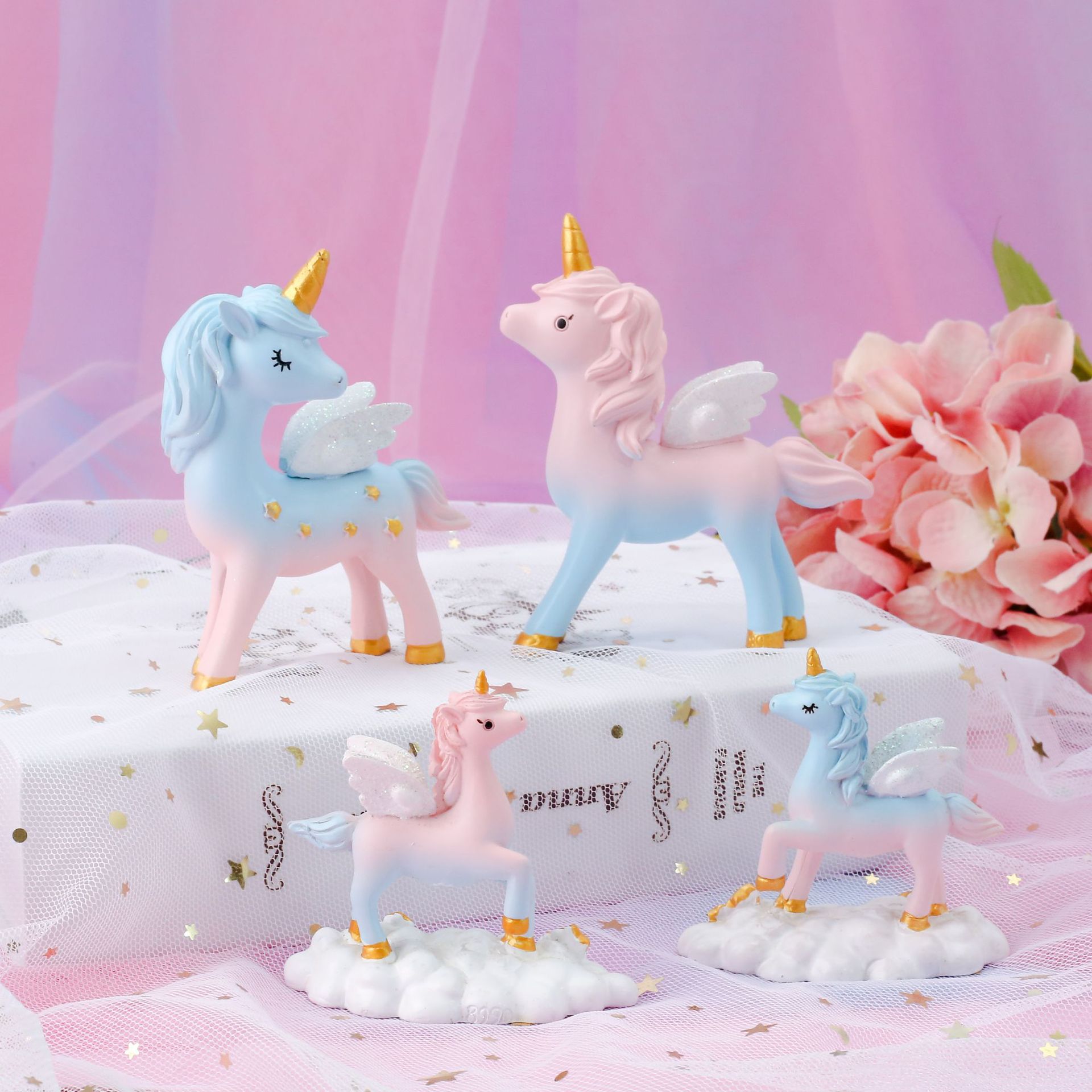 新作の夢の星空のユニコーンのケーキは装飾品を飾ってアイデアの自動車の車の樹脂の装飾品を並べます。
