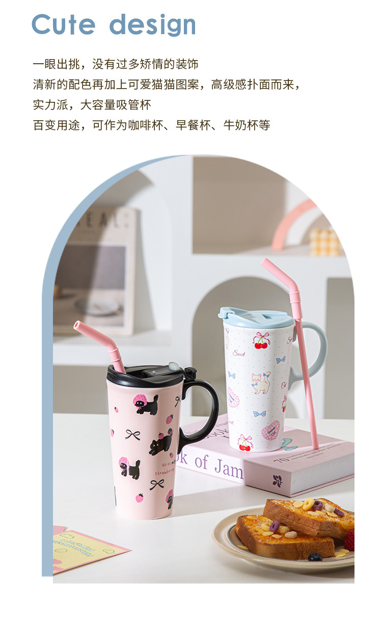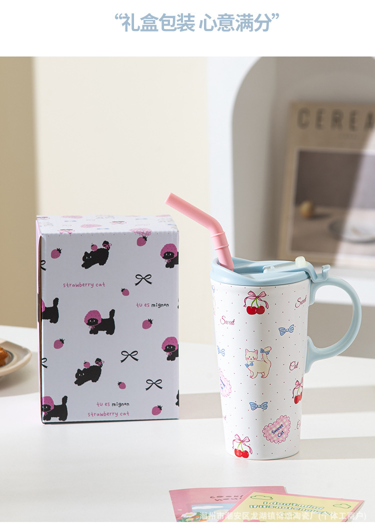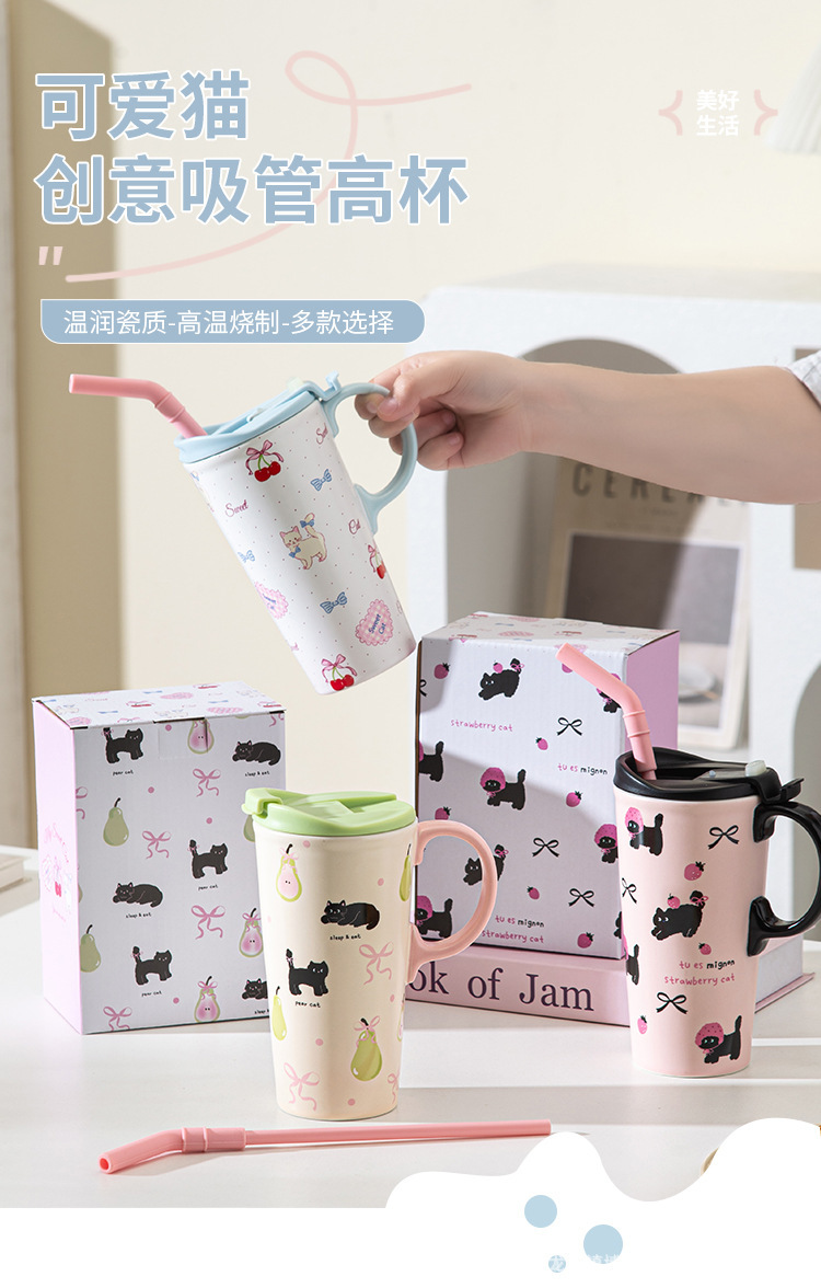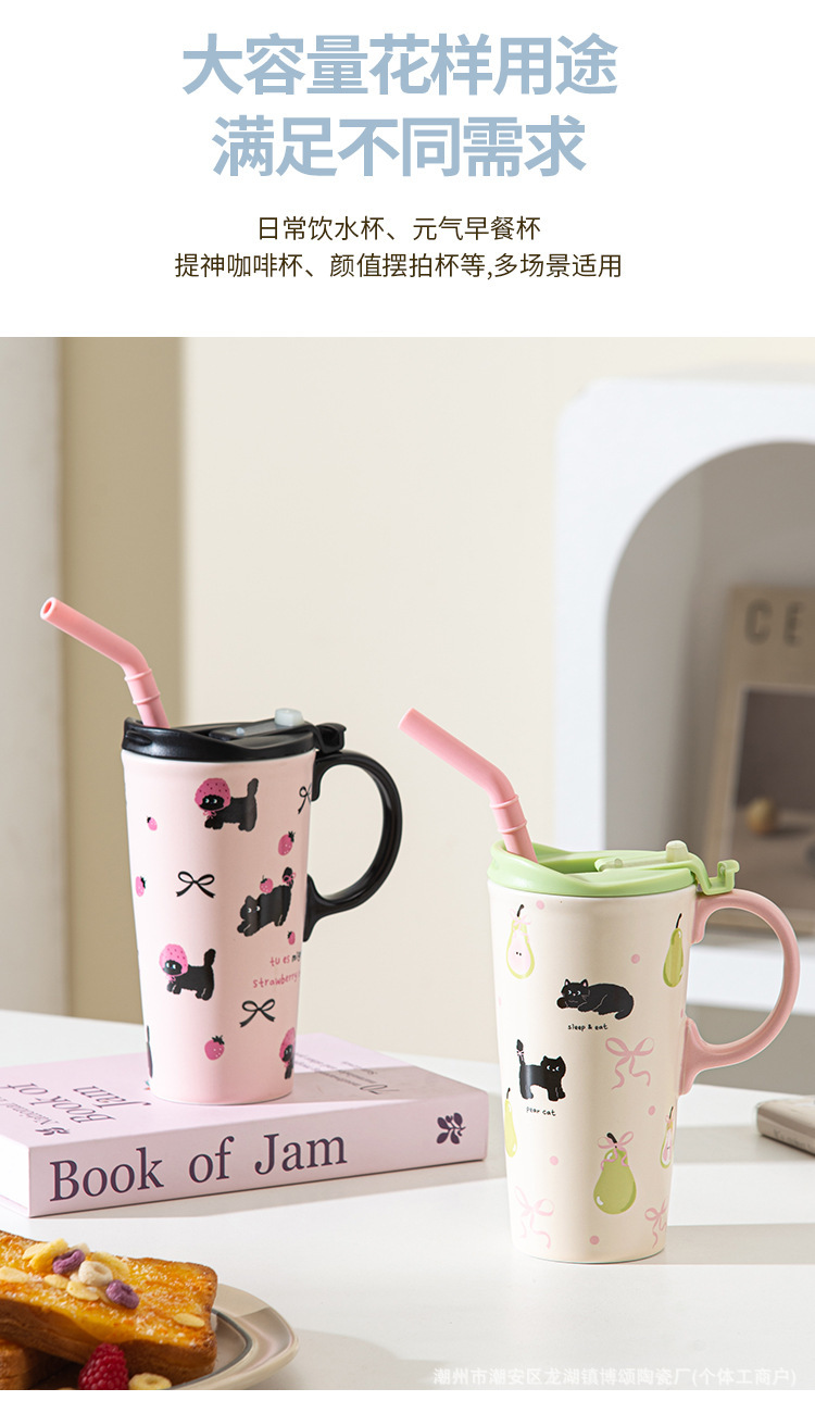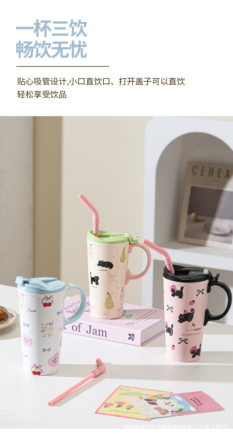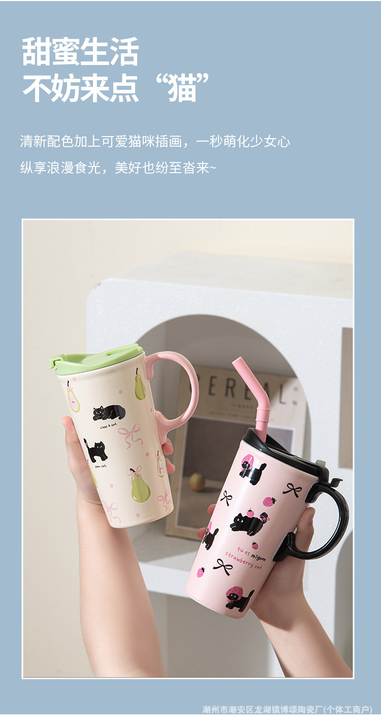 猫のマグカップ 大容量 ストロー付き 水筒 蓋付き 陶器製カップ 高品質 誕生日プレゼント お土産 可愛い