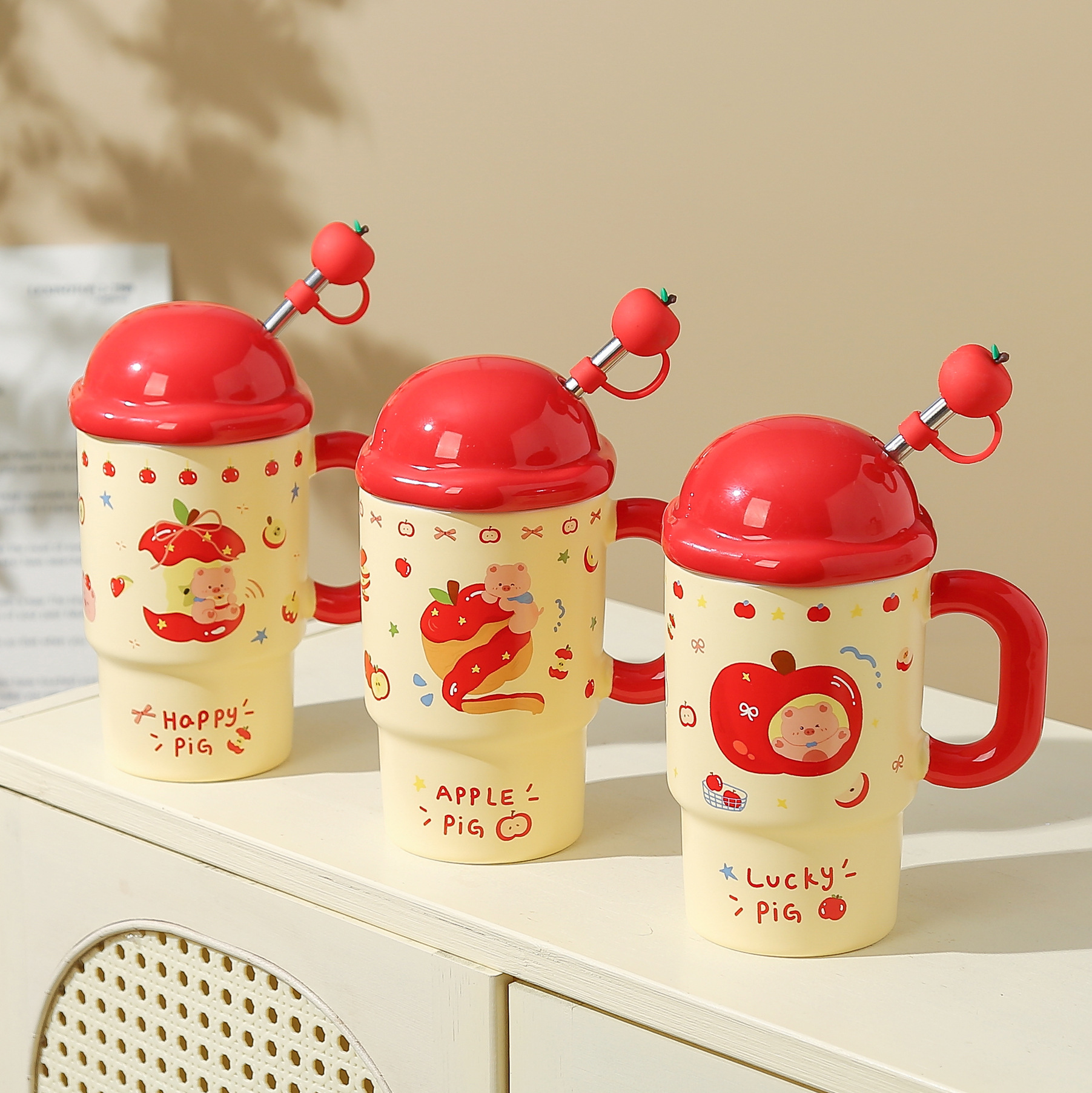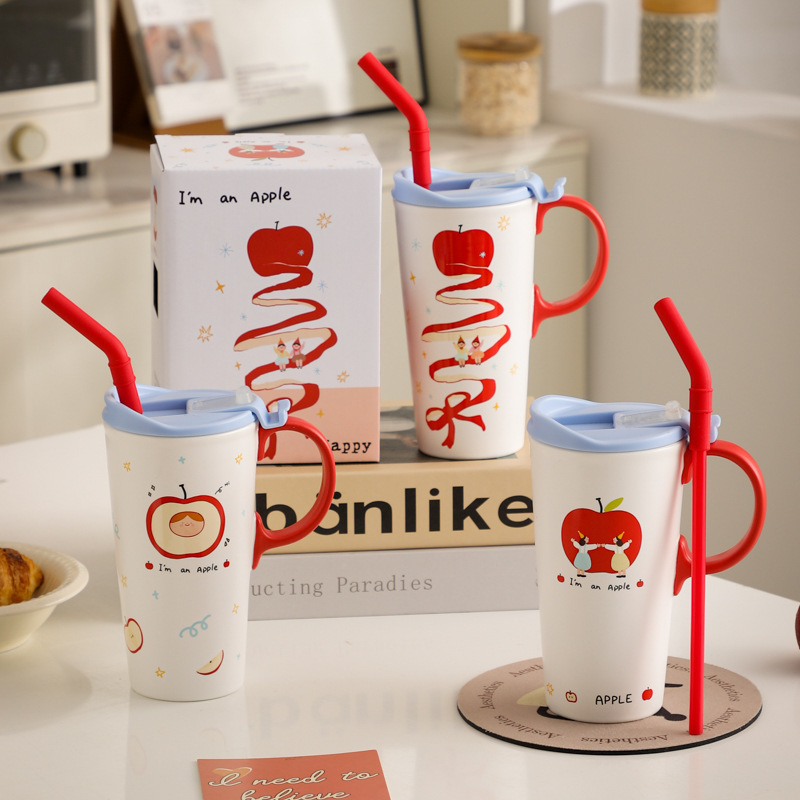 苹果女孩马克杯大容量带吸管吨吨杯高颜值带盖陶瓷杯宿舍家用水杯