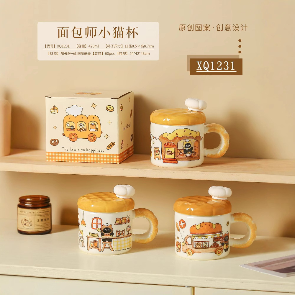 创意面包小猫马克杯卡通猫咪陶瓷杯带盖情侣水杯生日礼物伴手礼物