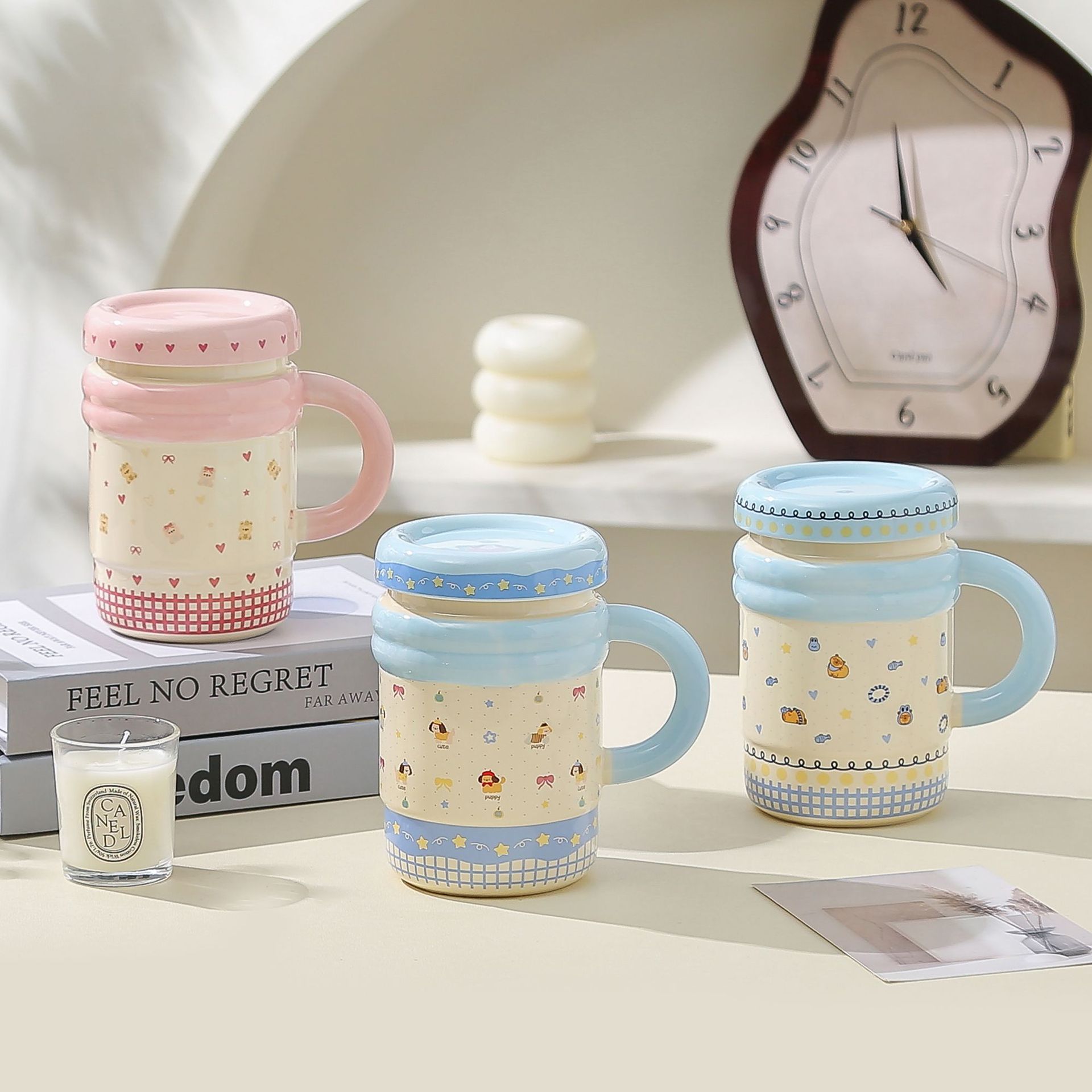 卡通带盖马克杯大容量陶瓷水杯情侣家用杯子女生高颜值咖啡早餐杯