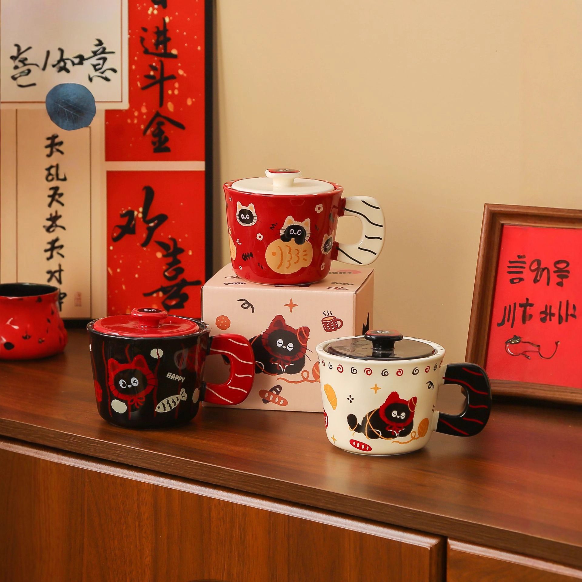 手描きのレリーフ猫セラミックカップ、クリエイティブな漫画マグカップ、寮の家庭用蓋付きウォーターカップ、見栄えの良いお土産