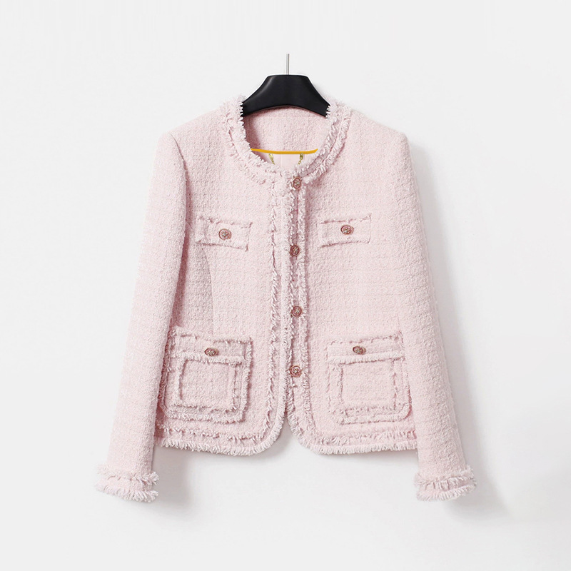 単独で2025新型フランス式ファッション減齢カジュアルロマンチックなピンクのフリンジの縁の布の気質の小さい香風のコートを設けます。