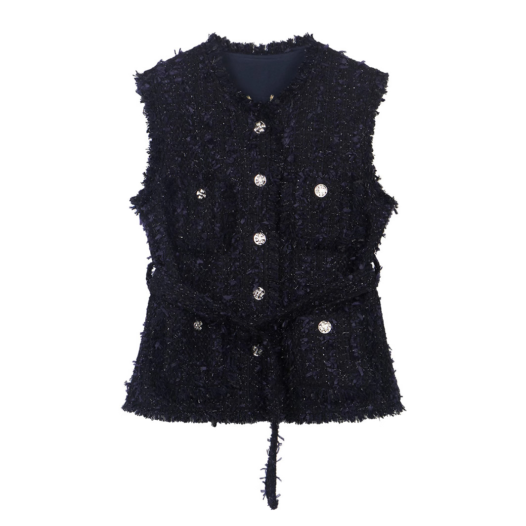 フレンチスタイルの軽やかな高級感、フリンジ付きの小香風ベスト、ウエストシェイプがおしゃれなベストジャケット M28882