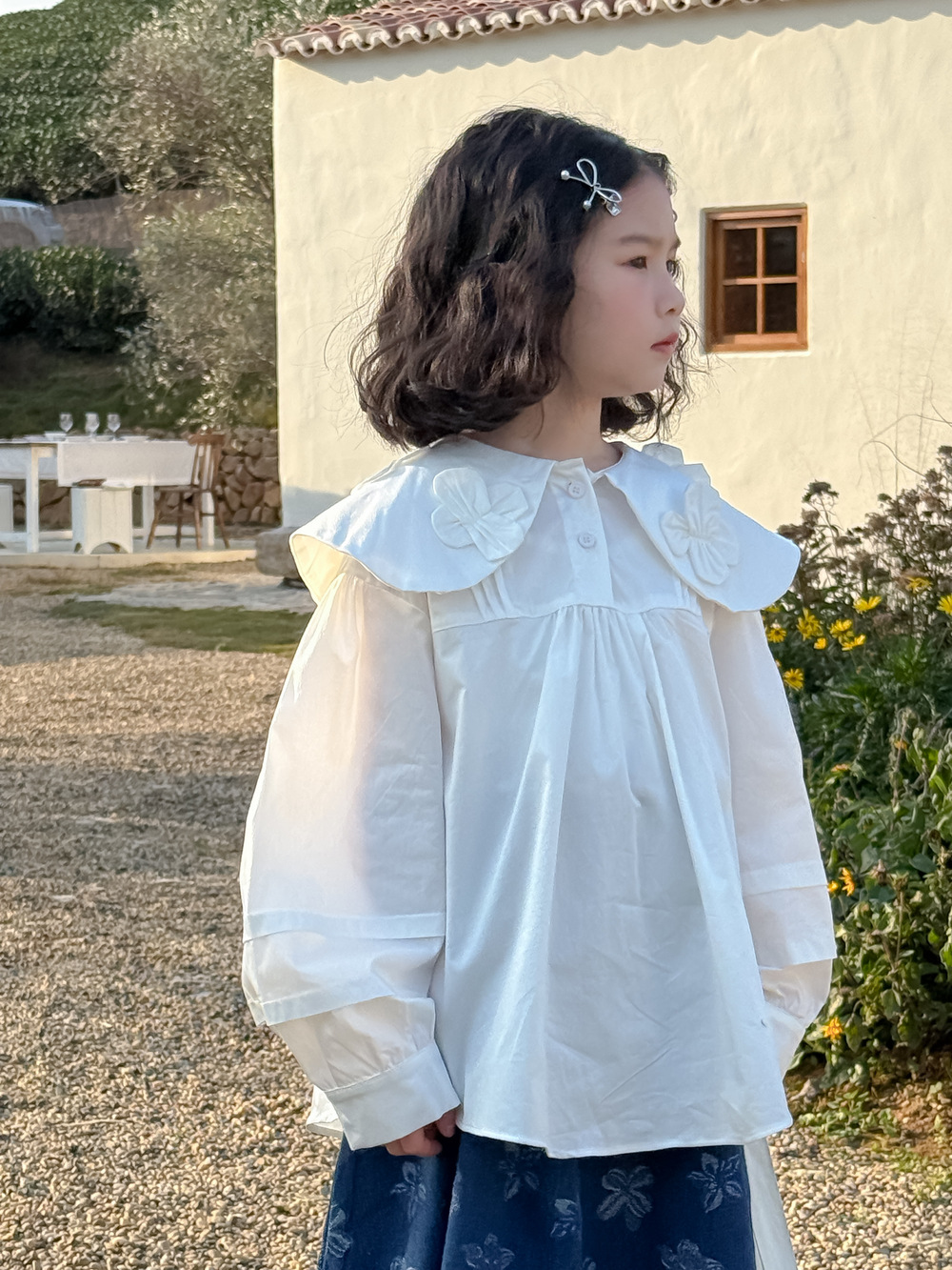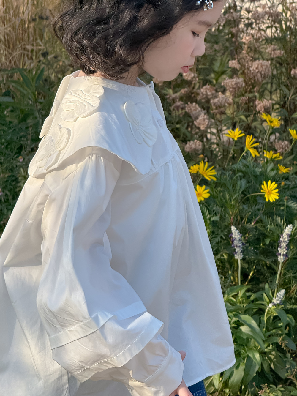 子供用シャツ2025春の女の子の韓国版の花の縁の襟の泡の袖のシャツの子供のカジュアルなゆったりとした花の上着