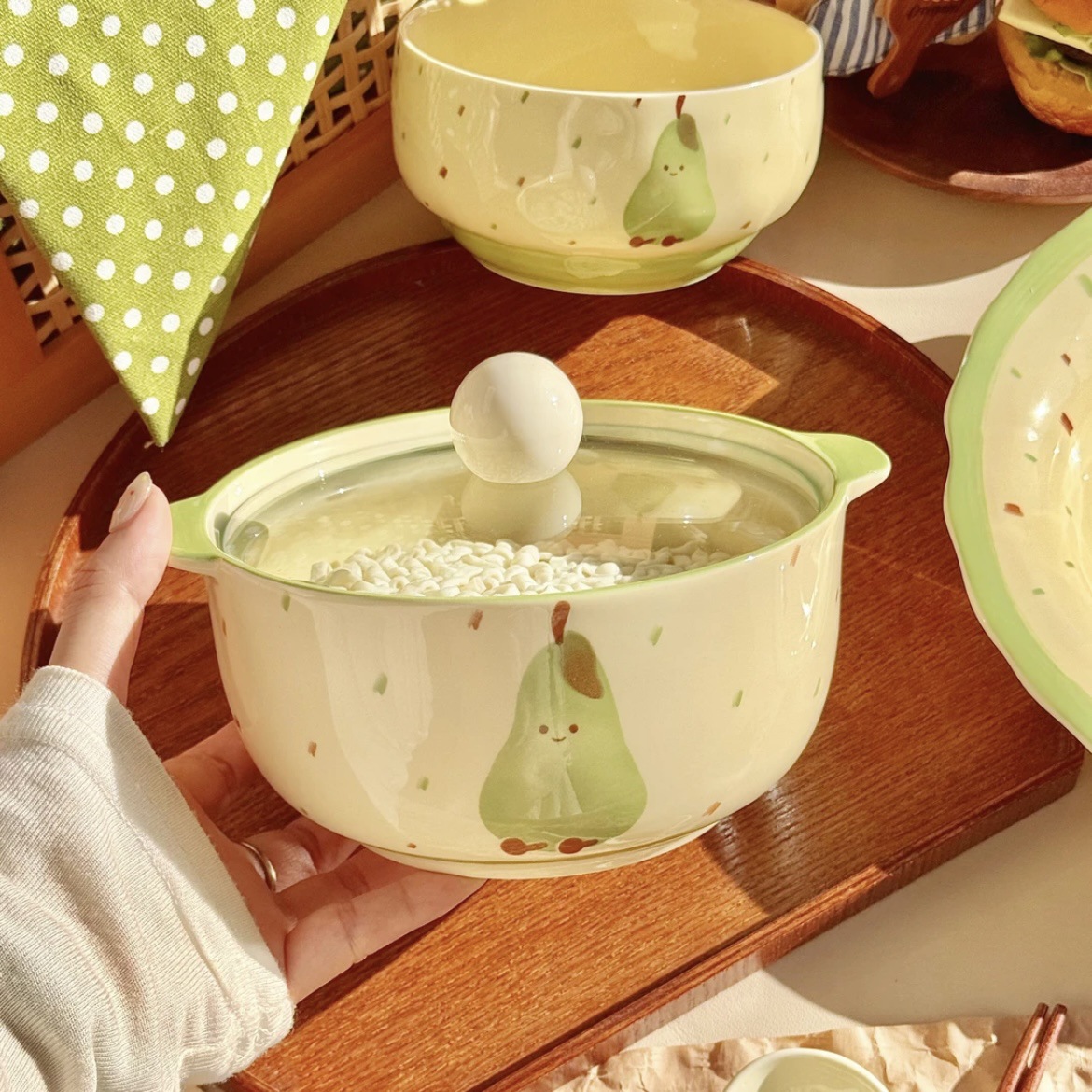 かわいいグリーン梨セラミックインスタントラーメンボウル蓋付きインスタイル家庭用下絵色双耳抗火傷カタツムリヌードルボウル大容量