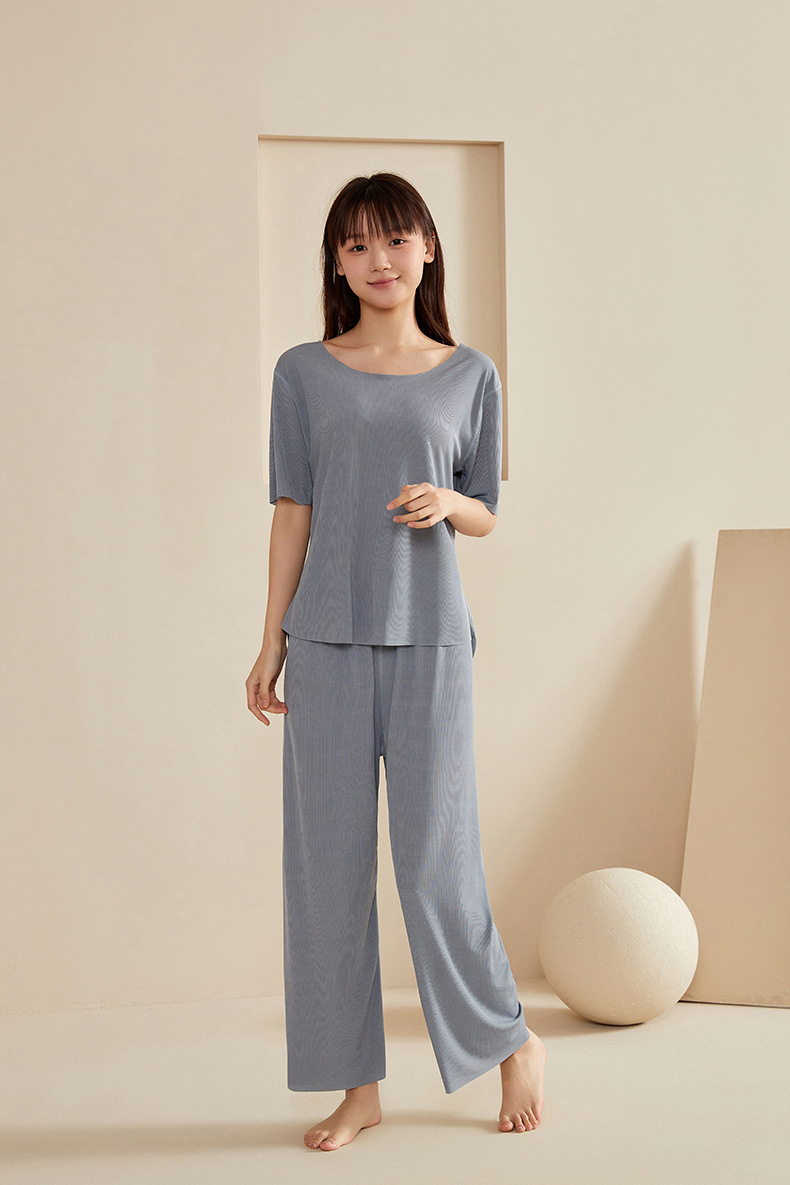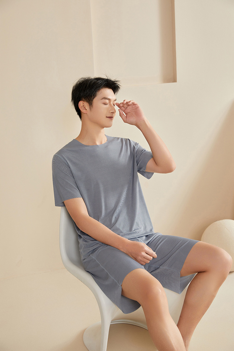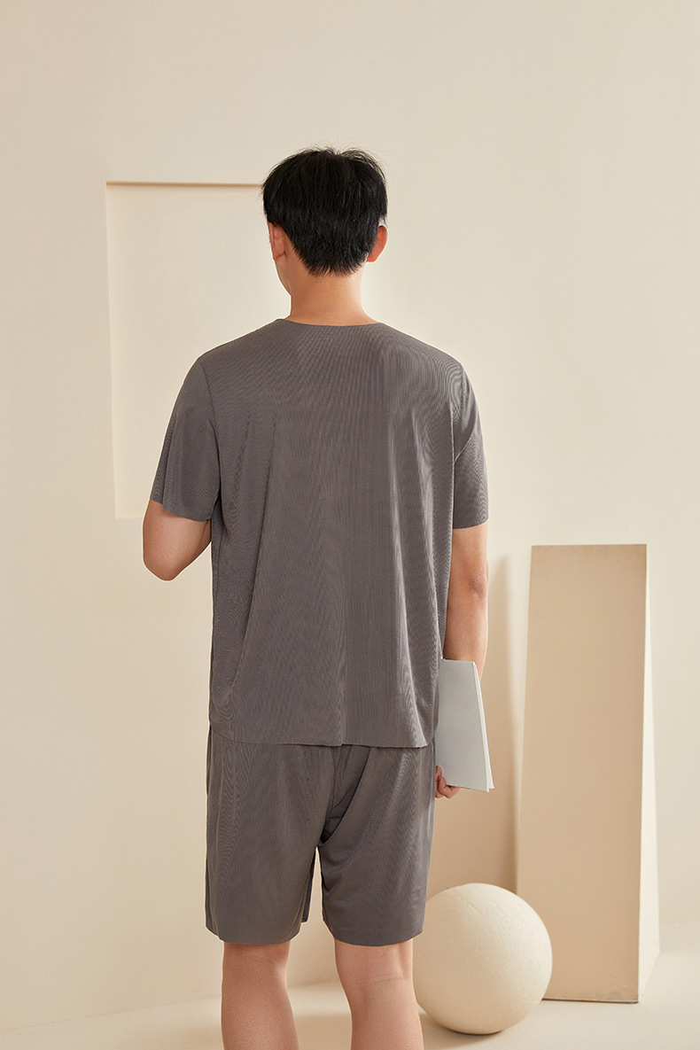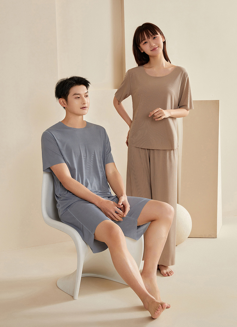 カップルの氷糸の家の服の夏のタイプの女性の丸首の半袖のズボンのスーツの男性の半ズボンの無痕の氷糸のパジャマ