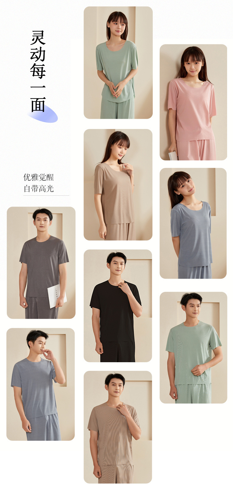 カップルパジャマ女性丸首半袖パジャマセット夏半ズボン男性薄金無痕氷糸ホームウェア卸売り