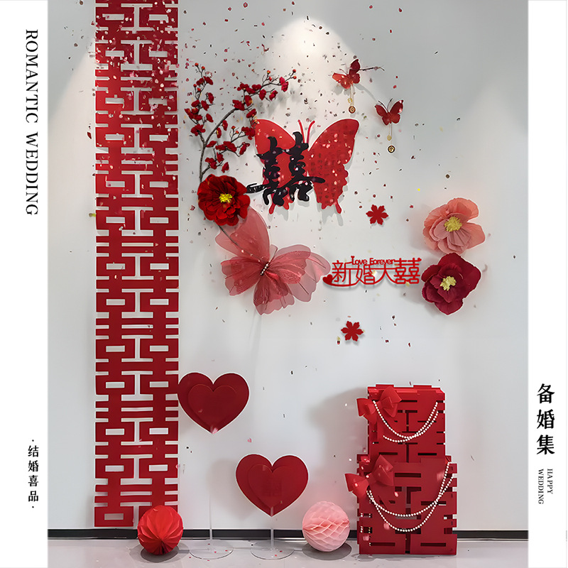 結婚式の部屋の配置セットの蝶の花の装飾の長い条の喜字の新しい部屋の客間のカーテンの背景の結婚用品の大全