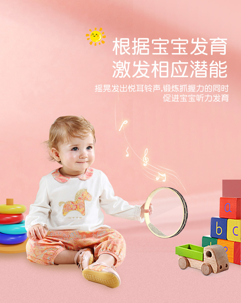 オルフの打楽器の赤ちゃんの木製の手は鈴を振って頭を上げます。