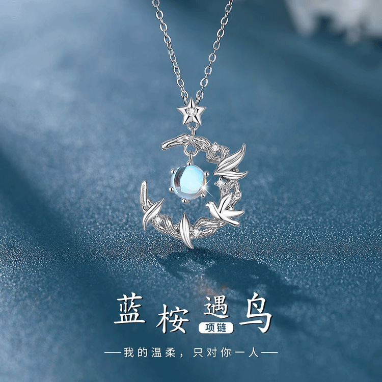 星の月の青いユーカリと鳥の銀のネックレスの女性の大衆の気質は高級な質感を設計します。