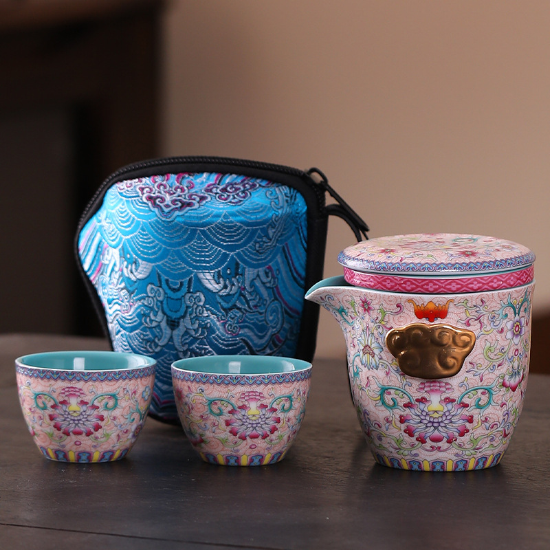 康禾 宫廷风珐琅彩旅行茶具一壶三杯户外便携简易泡茶快客小套装