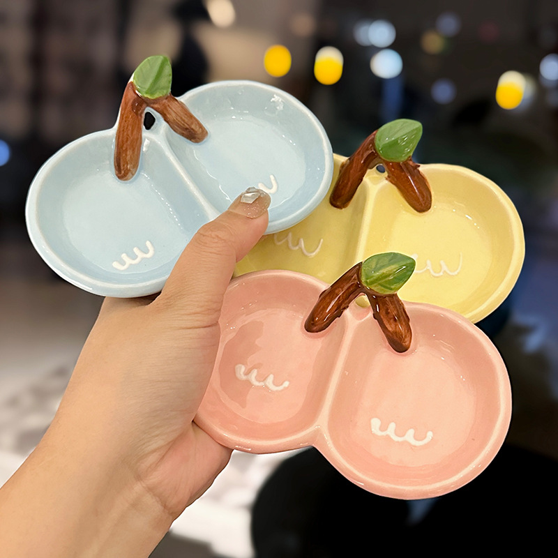 女の子の高颜値ピンクさくらんぼ双格付料皿調味料皿クリエイティブ醤油酢皿陶磁器釉薬下彩皿