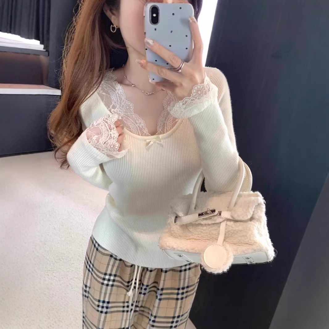 甜辣白色蕾丝V领毛衣女2025秋冬高级小香风内搭针织打底长袖上衣