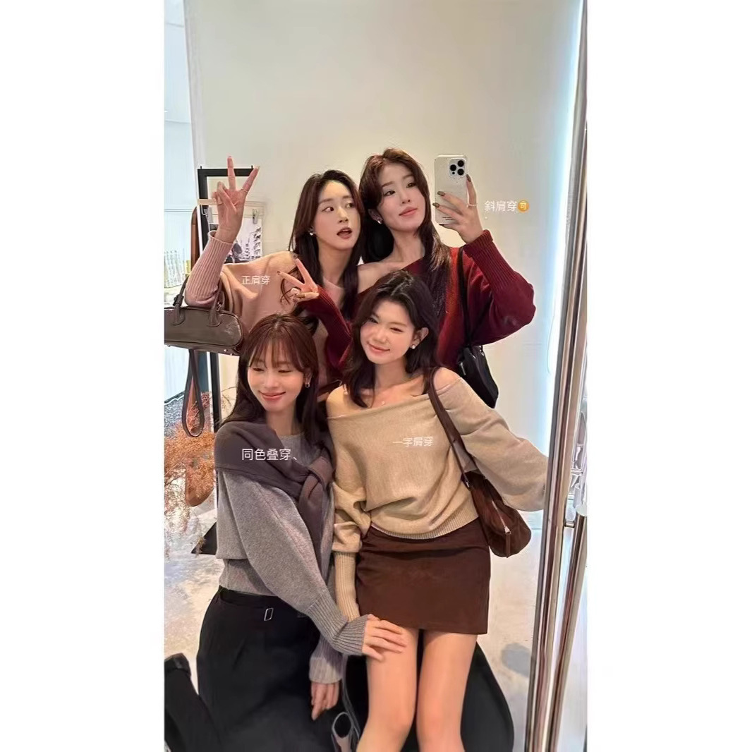 纯欲露肩锁骨长袖一字肩针织衫毛衣女春秋一字领打底衫外穿上衣