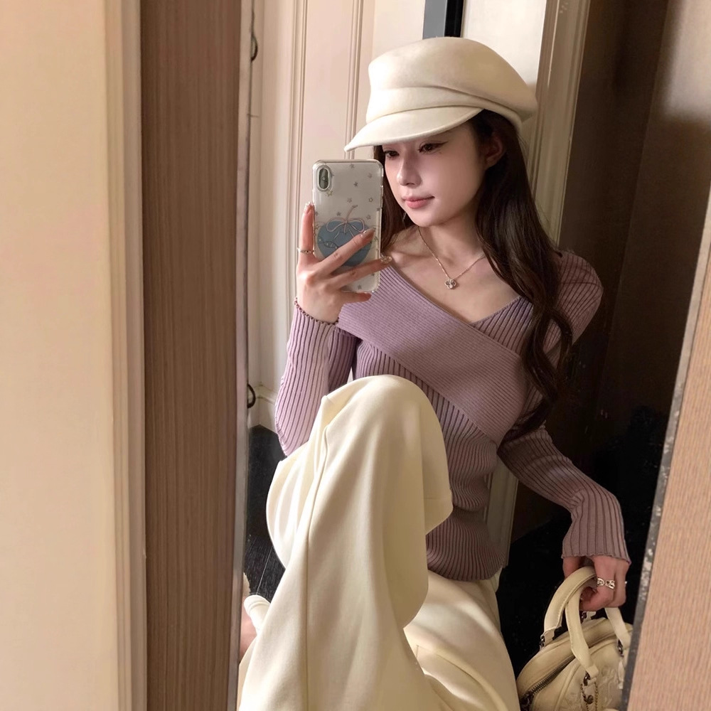 设计感灰紫色交叉V领针织打底衫女秋季锁骨修身显瘦毛衣露肩上衣