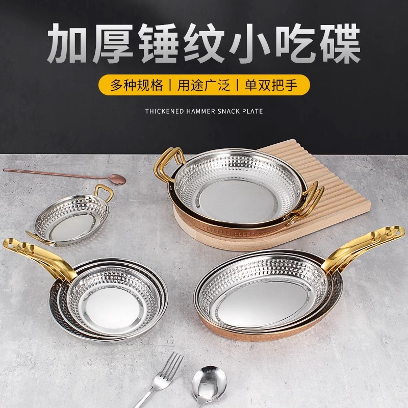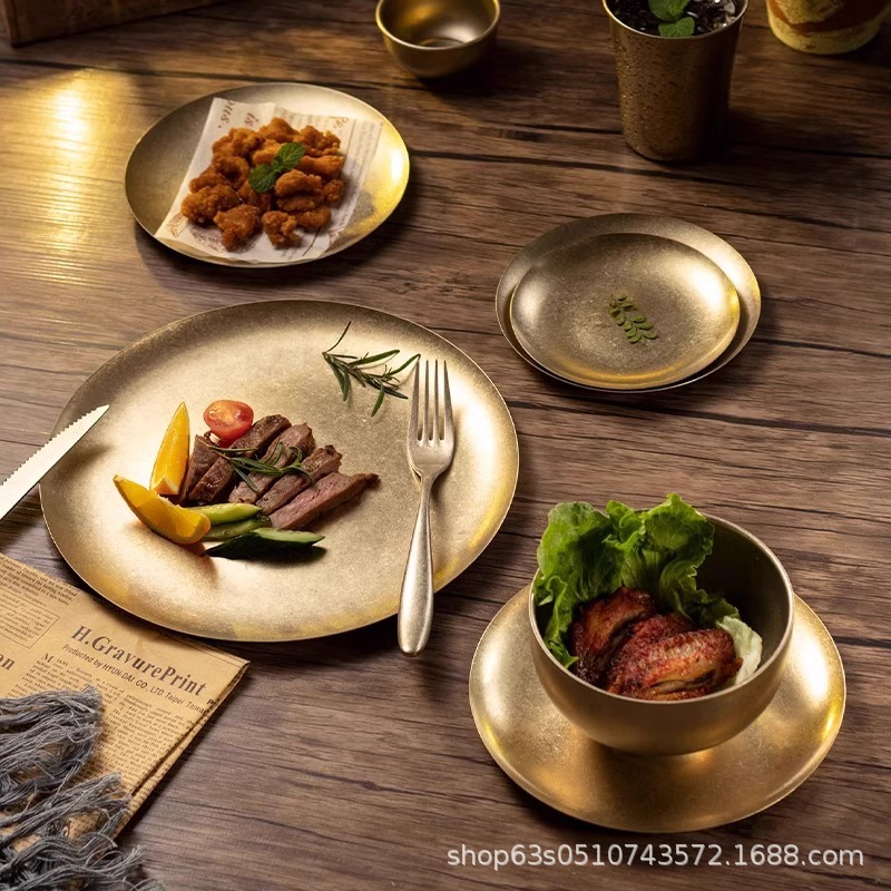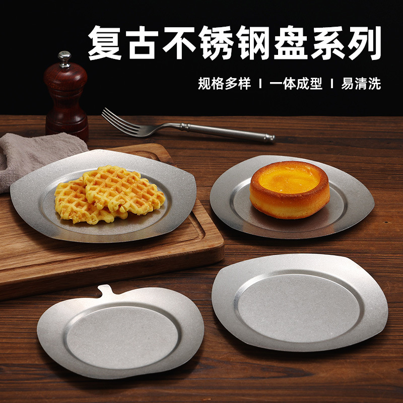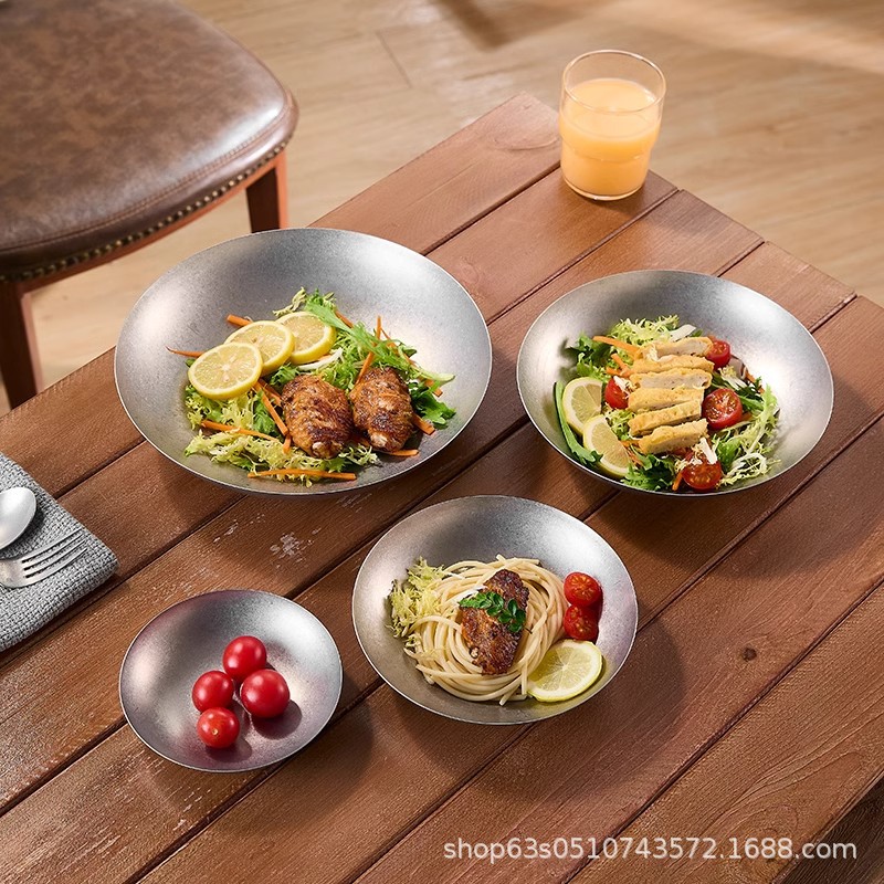 レトロ 304 ステンレス鋼ラウンドプレートサラダプレートキムチプレート調味料プレート浅いプレートスナックプレート古いラウンドプレートディナープレート