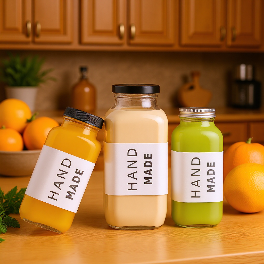 食品グレードのマルチ仕様の厚みのある蓋付き正方形および円形ガラスボトル、密封された透明なミルクティー飲料ボトル、カスタマイズ