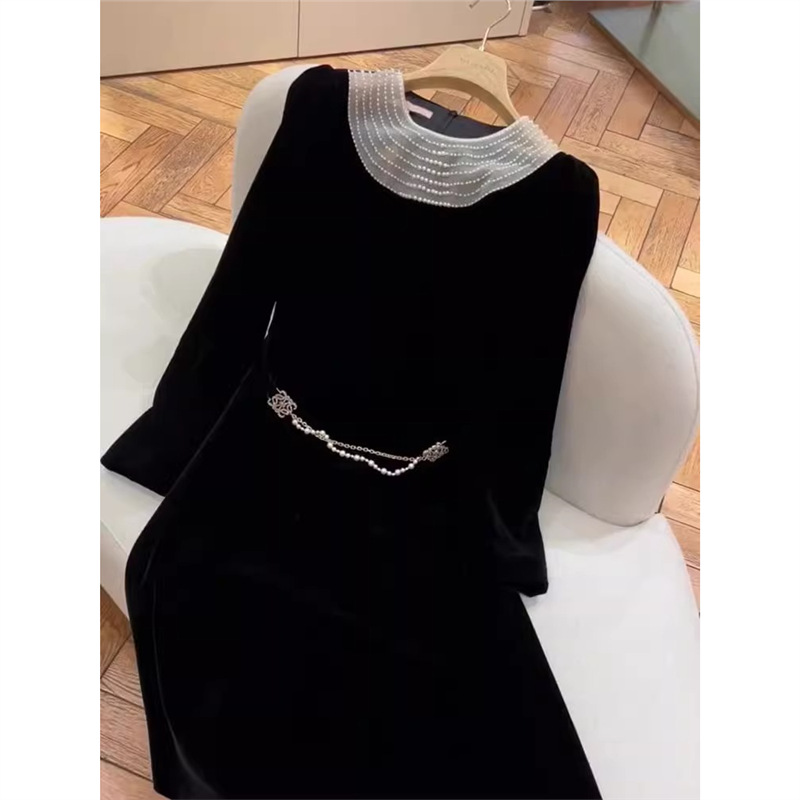 8490フランス気質名媛高級精致女神範黒ベロアワンピース女性秋冬