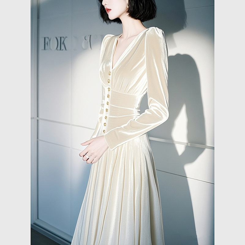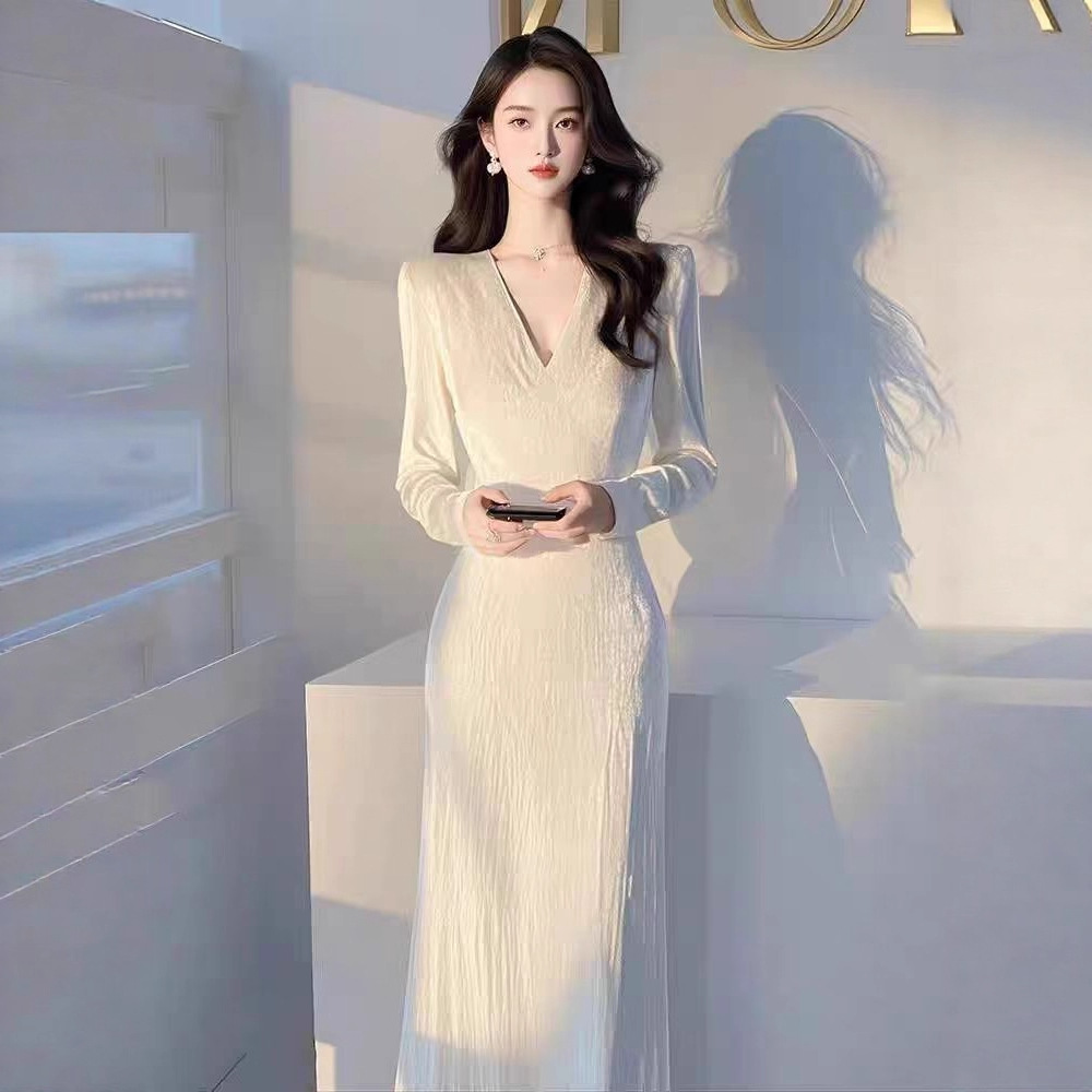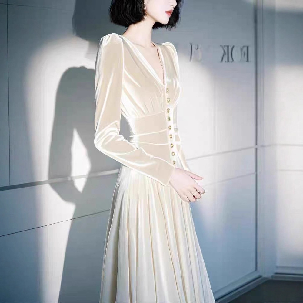 富家千金白色长袖丝绒连衣裙女2025秋季法式显身材收腰礼服长裙子