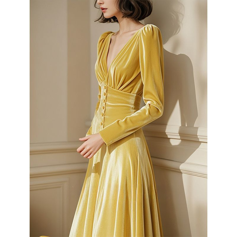 山力达迪秋冬黄色v领丝绒连衣裙富家千金高级感气质收腰御姐风情