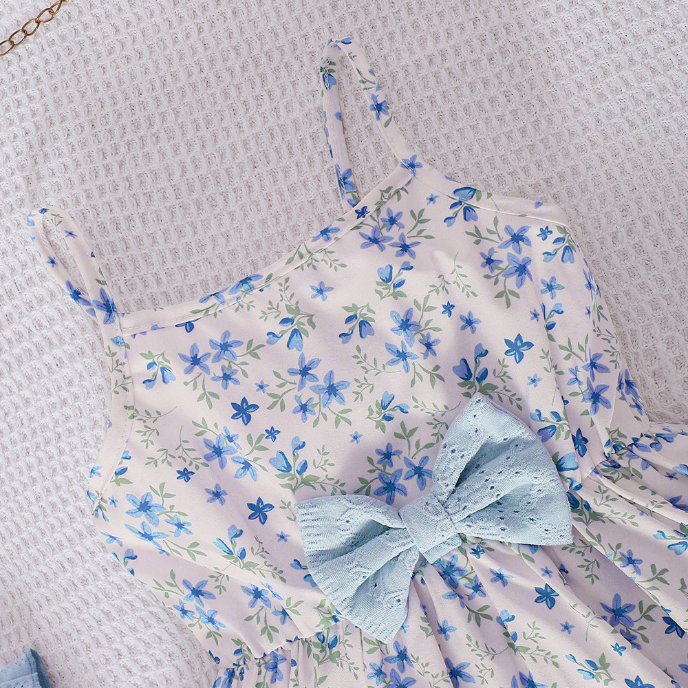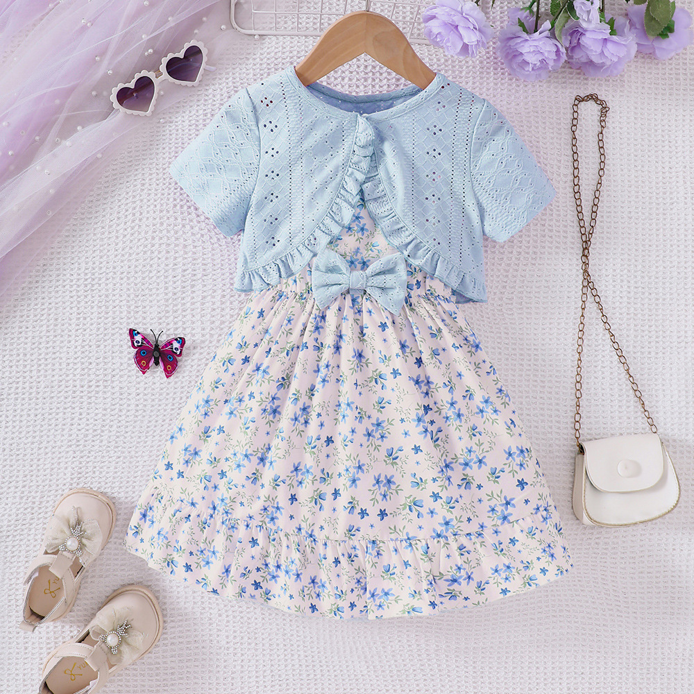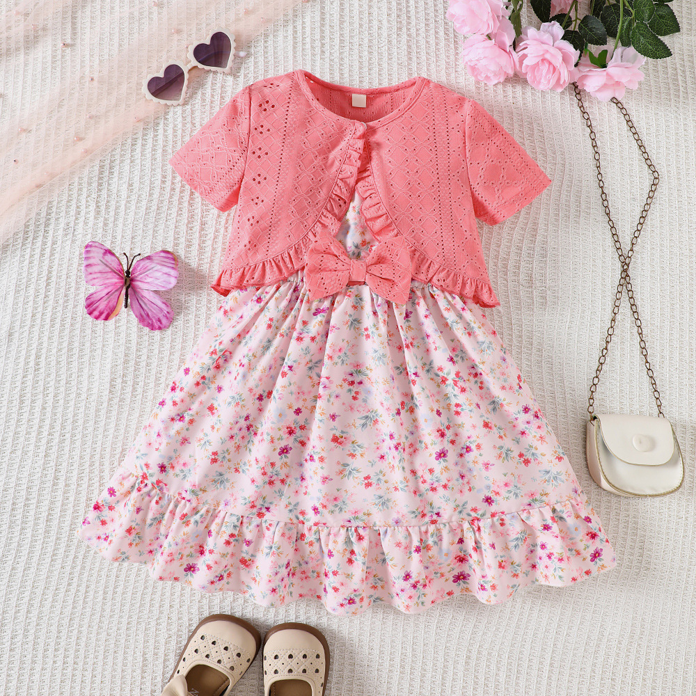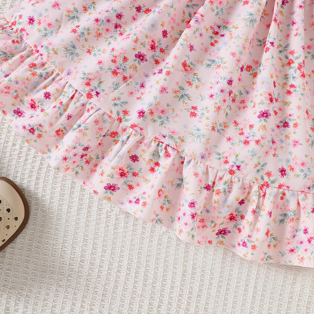 外国貿易の子供のガーターはワンピースの2025夏の小さい花の結び目の多層のケーキのスカートの女の子を持ちます。