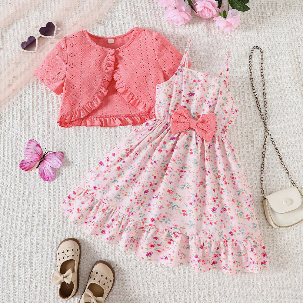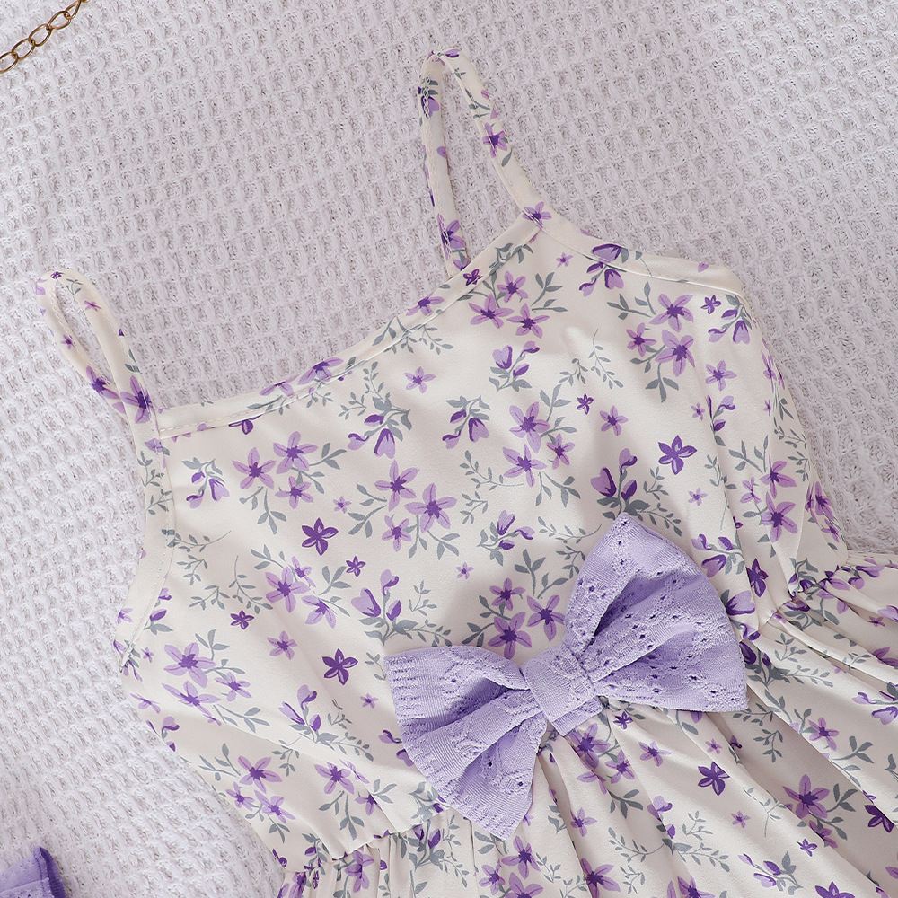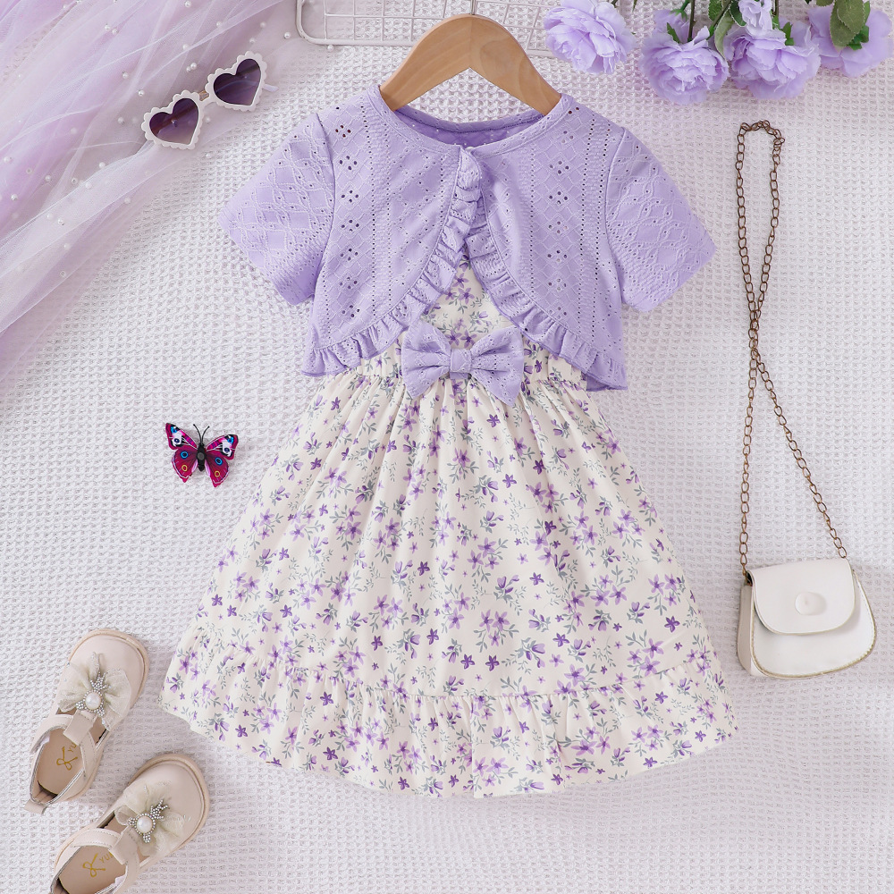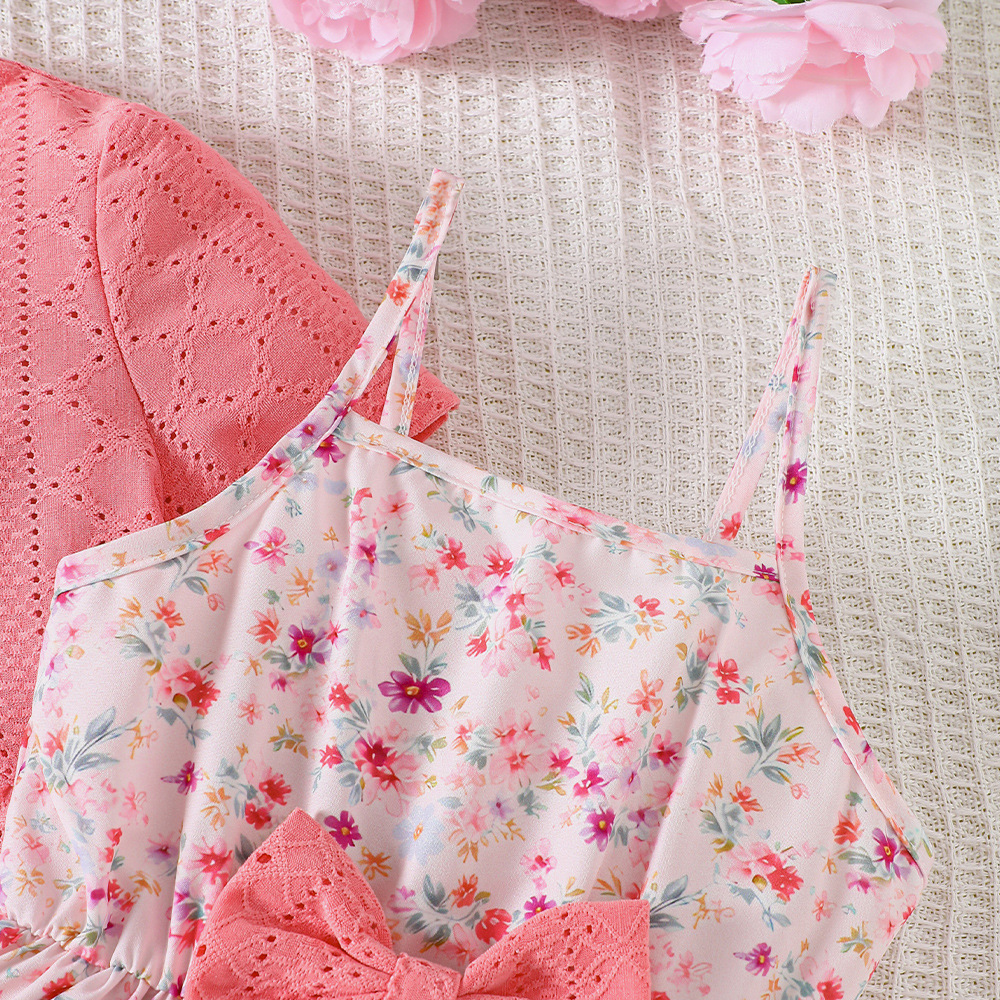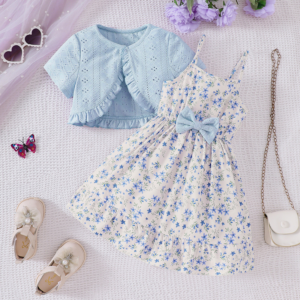 外国貿易の子供のガーターはワンピースの2025夏の小さい花の結び目の多層のケーキのスカートの女の子を持ちます。