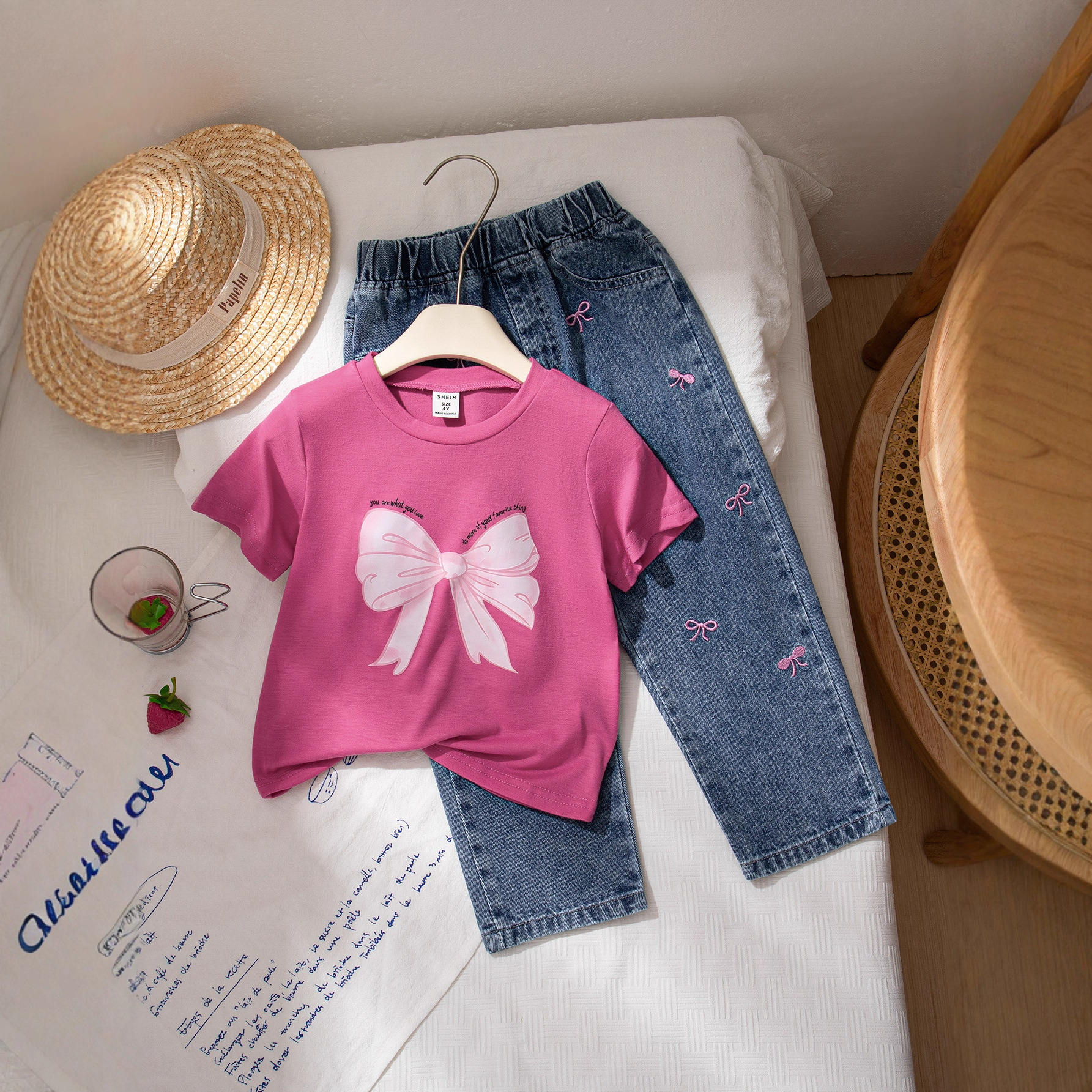 女童夏季新款短袖T恤前幅蝴蝶结印花牛仔蝴蝶结绣花长裤休闲套装