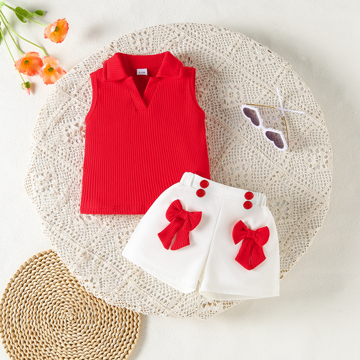亚马逊甜美学步女孩无袖翻领开胸坑条上衣贴花扣子短裤夏季两件套