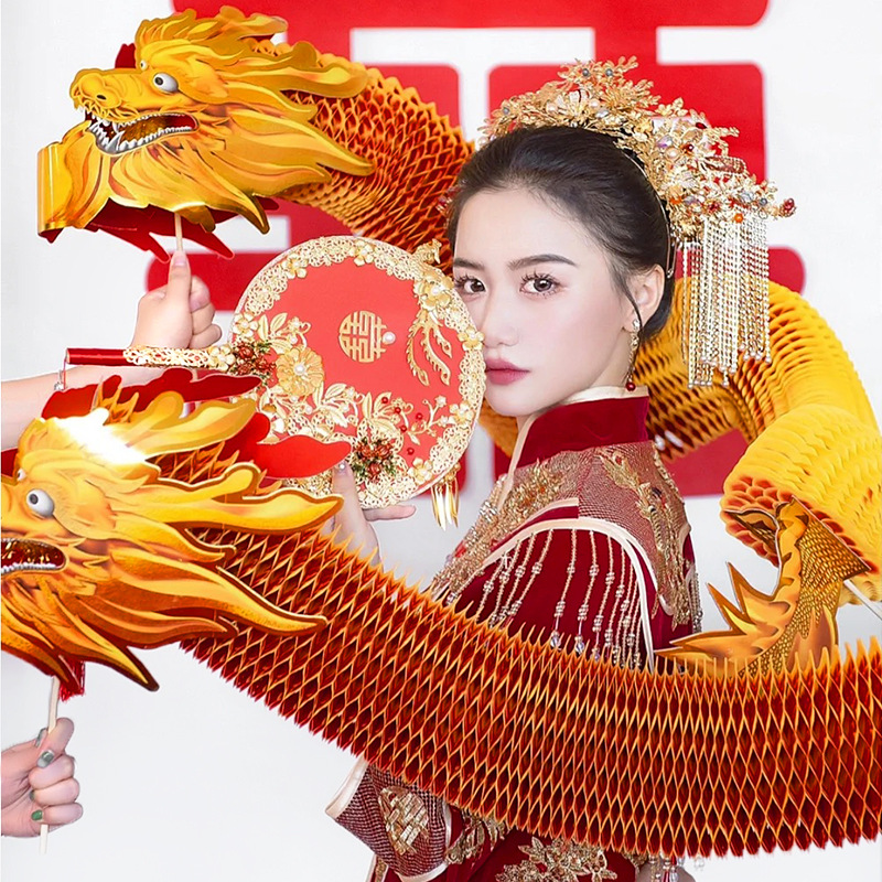新年の結婚の竜の写真の道具は花を引いて竜の子供を踊ります。