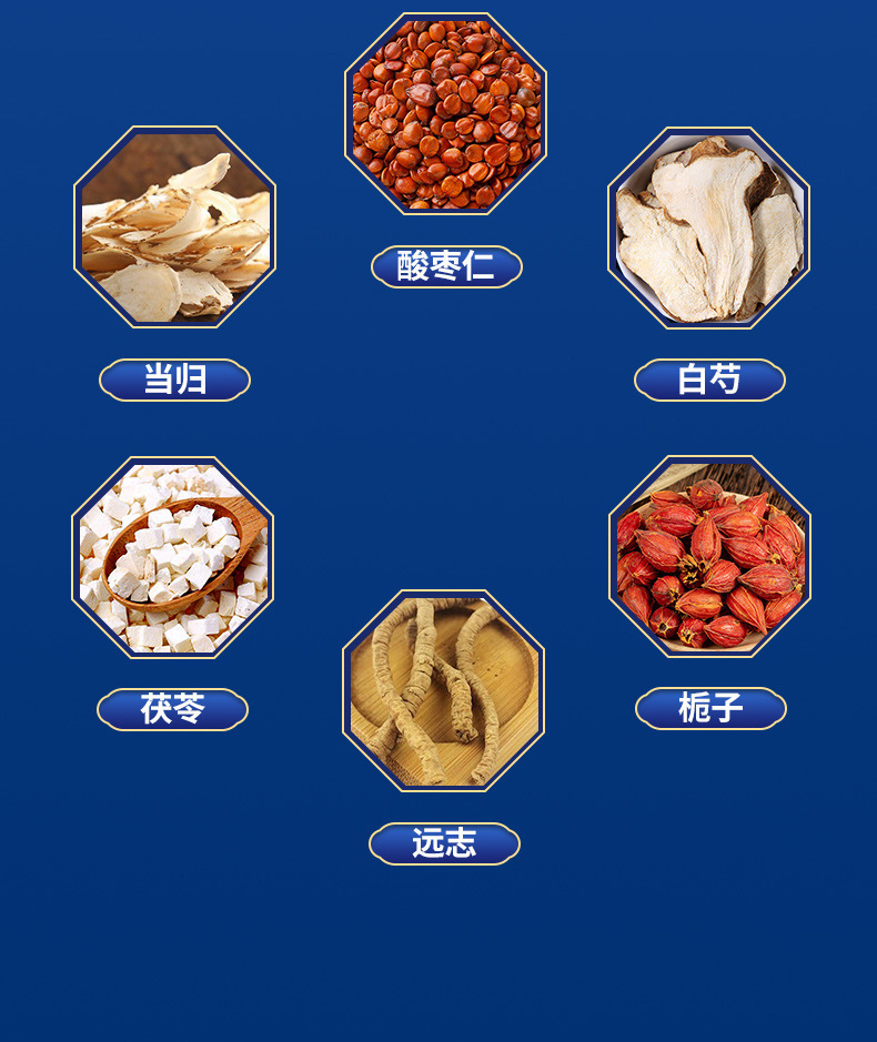 主な原材料 ジジフス種子、アンジェリカ、ポリガラ、白牡丹、ポリア、クチナシ