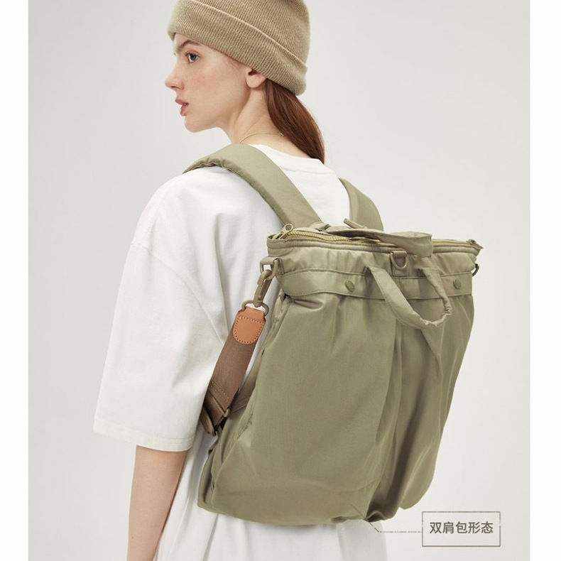 三用ヘルメットでレトロなリュックサックを包んでいます。