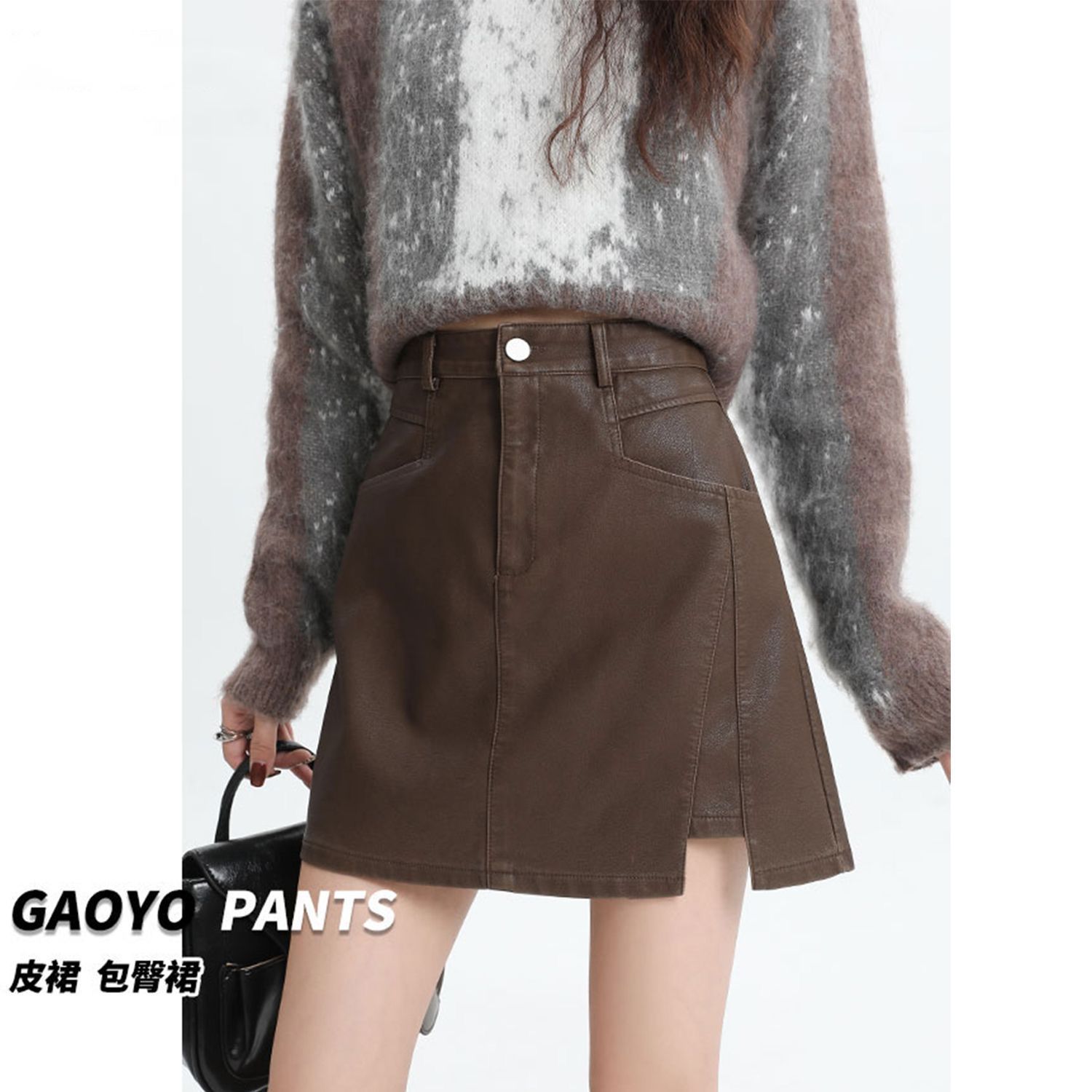 咖色皮裙半身裙女秋高腰a字包臀超火PU皮短裙美拉德穿搭掐腰半裙