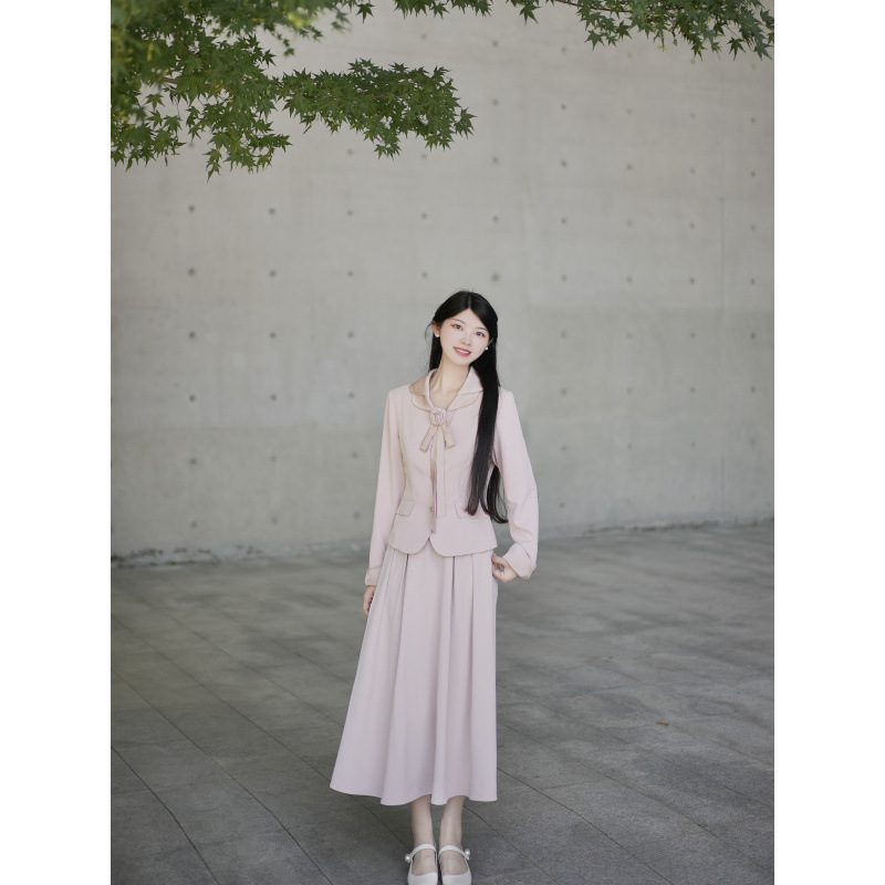 2025秋季新款日常通勤大方得体裸色玫瑰缎面优雅上衣半身裙套装女